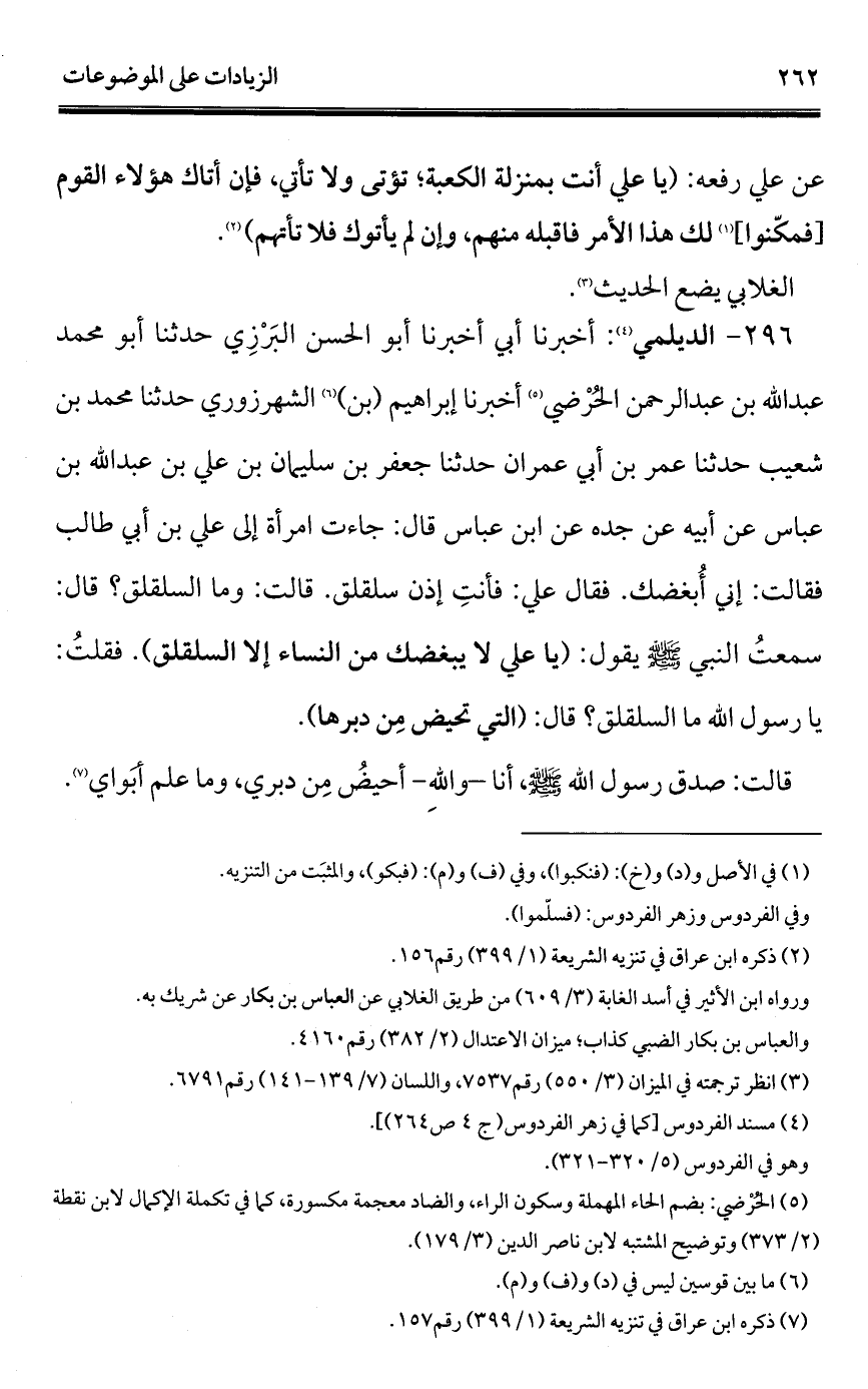 296 - الديلمي (¬1): أخبرنا أبي أخبرنا أبو الحسن البَرْزِي حدّثنا أبو محمد عبد الله بن عبد الرحمن الحُرْضي (¬2) أخبرنا إبراهيم (بن) (¬3) الشهرزوري حدّثنا محمد بن شعيب حدّثنا عمر بن أبي عمران حدّثنا جعفر بن سليمان بن علي بن عبد الله بن عباس عن أبيه عن جده عن ابن عباس قال: جاءت امرأة إلى علي بن أبي طالب فقالت: إنِّي أُبغضك. فقال علي: فأنتِ إذن سلقلق. قالت: وما السلقلق؟ قال: سمعتُ النَّبيُّ - صلى الله عليه وسلم - يقول: (يا علي لا يبغضك من النساء إلا السلقلق). فقلتُ: يا رسول الله ما السلقلق؟ قال: (التي تحيض مِن دبرها).