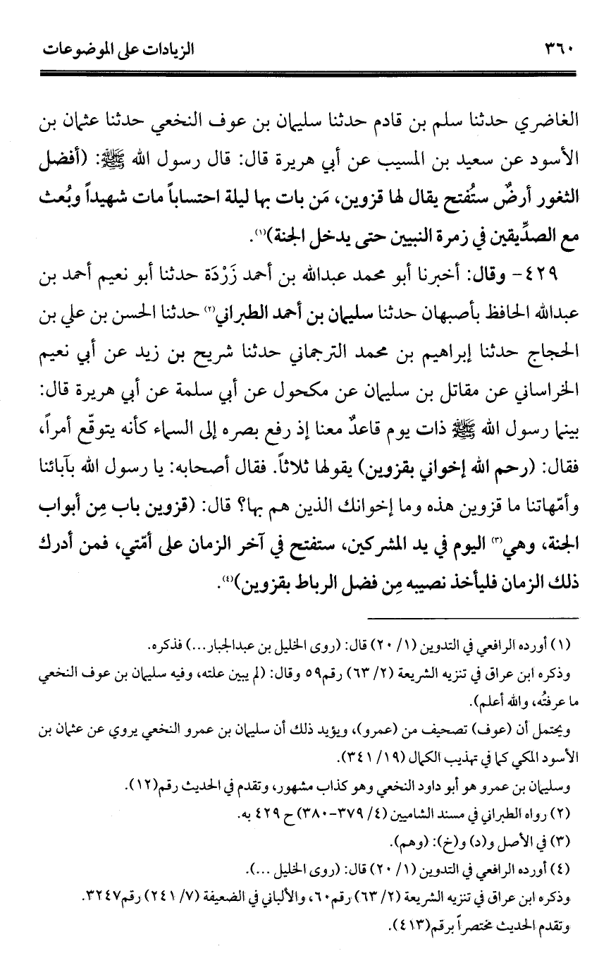 429 - وقال: أخبرنا أبو محمد عبد الله بن أحمد زَرْدَة حدثنا أبو نعيم أحمد بن عبد الله الحافظ بأصبهان حدثنا سليمان بن أحمد الطبراني (¬1) حدثنا الحسن بن علي بن الحجاج حدثنا إبراهيم بن محمد الترجماني حدثنا شريح بن زيد عن أبي نعيم الخراساني عن مقاتل بن سليمان عن مكحول عن أبي سلمة عن أبي هريرة قال: بينما رسول الله - صلى الله عليه وسلم - ذات يوم قاعدٌ معنا إذ رفع بصره إلى السماء كأنه يتوقّع أمراً، فقال: (رحم الله إخواني بقزوين) يقولها ثلاثاً. فقال أصحابه: يا رسول الله بآبائنا وأمّهاتنا ما قزوين هذه وما إخوانك الذين هم بها؟ قال: (قزوين باب مِن أبواب الجنة، وهي (¬2) اليوم في يد المشركين، ستفتح في آخر الزمان على أمّتي، فمن أدرك ذلك الزمان فليأخذ نصيبه مِن فضل الرباط بقزوين) (¬3).