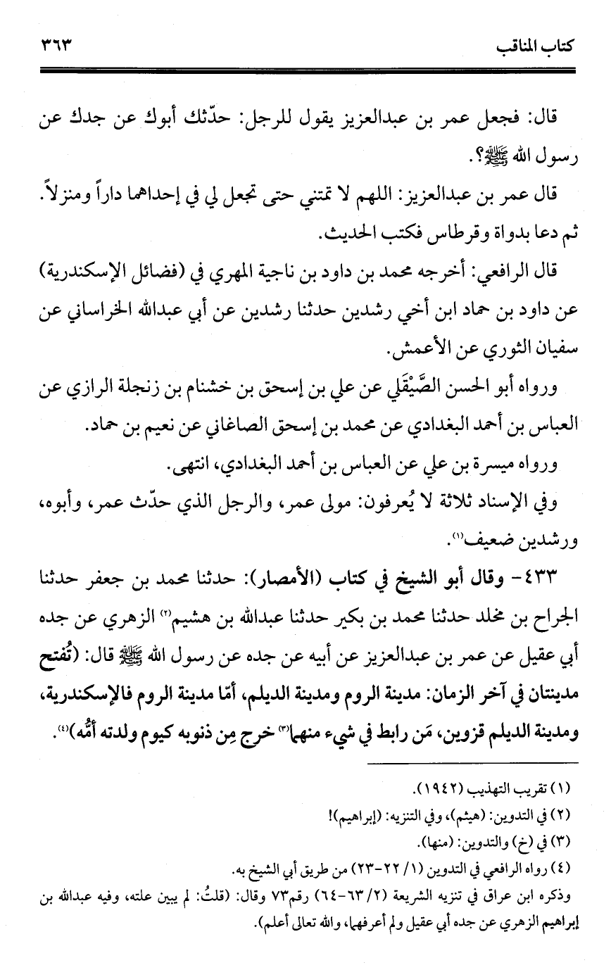 433 - وقال أبو الشيخ في كتاب (الأمصار): حدثنا محمد بن جعفر حدثنا الجراح بن مخلد حدثنا محمد بن بكير حدثنا عبد الله بن هشيم (¬1) الزهري عن جده أبي عقيل عن عمر بن عبد العزيز عن أبيه عن جده عن رسول الله - صلى الله عليه وسلم - قال: (تُفتح مدينتان في آخر الزمان: مدينة الروم ومدينة الديلم، أمّا مدينة الروم فالإسكندرية، ومدينة الديلم قزوين، مَن رابط في شيء منهما (¬2) خرج مِن ذنوبه كيوم ولدته أمُّه) (¬3).