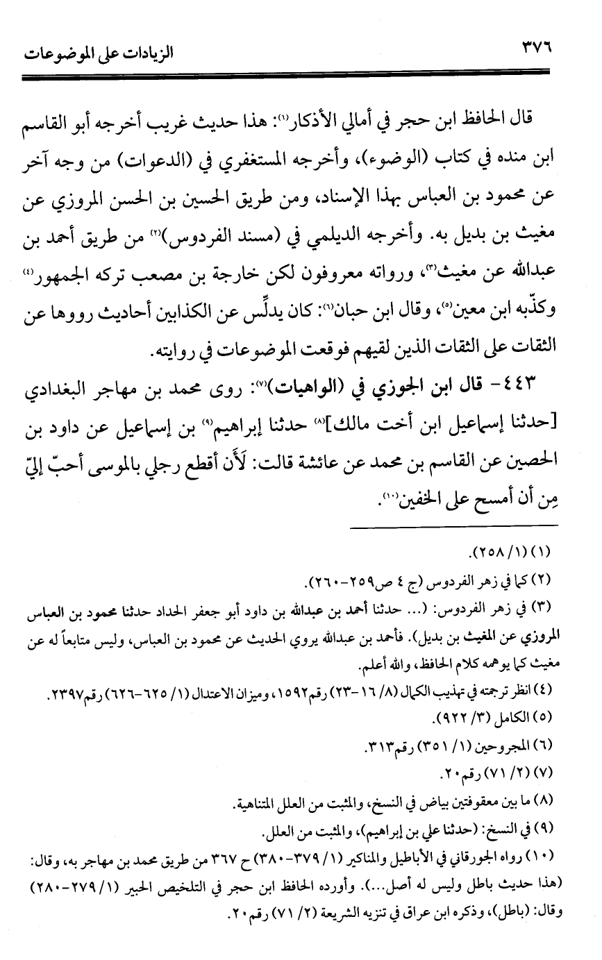 443 - قال ابن الجوزي في (الواهيات) (¬1): روى محمد بن مهاجر البغدادي [حدثنا إسماعيل ابن أخت مالك] (¬2) حدثنا إبراهيم (¬3) بن إسماعيل عن داود بن الحصين عن القاسم بن محمد عن عائشة قالت: لَأَن أقطع رجلي بالموسى أحبّ إليّ مِن أن أمسح على الخفين (¬4).