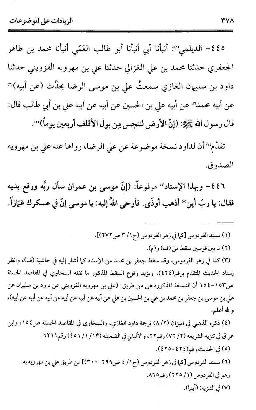 445 - الديلمي (¬1): أنبأنا أبي أنبأنا أبو طالب العَمّي أنبأنا محمد بن طاهر الجعفري حدثنا محمد بن علي الغزالي حدثنا علي بن مهرويه القزويني حدثنا داود بن سليمان الغازي سمعتُ علي بن موسى الرضا يحدِّث (عن أبيه) (¬2) عن أبيه محمد (¬3) عن أبيه علي بن الحسين عن أبيه عن أبيه علي بن أبي طالب قال: قال رسول الله - صلى الله عليه وسلم -: (إنّ الأرض لتنجس مِن بول الأقلف أربعين يوماً) (¬4).