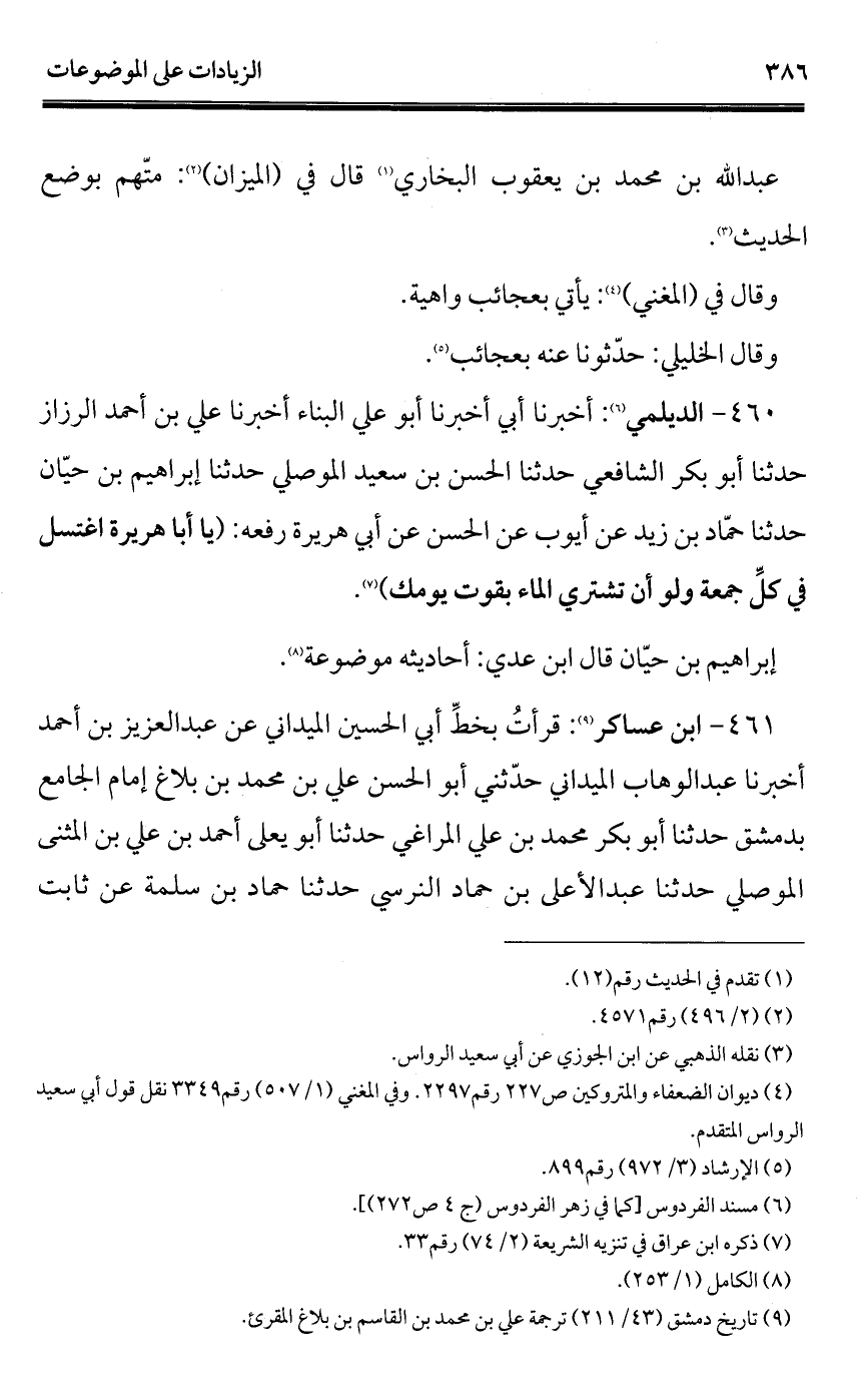 460 - الديلمي (¬1): أخبرنا أبي أخبرنا أبو علي البناء أخبرنا علي بن أحمد الرزاز حدثنا أبو بكر الشافعي حدثنا الحسن بن سعيد الموصلي حدثنا إبراهيم بن حيّان حدثنا حمّاد بن زيد عن أيوب عن الحسن عن أبي هريرة رفعه: (يا أبا هريرة اغتسل في كلِّ جمعة ولو أن تشتري الماء بقوت يومك) (¬2).