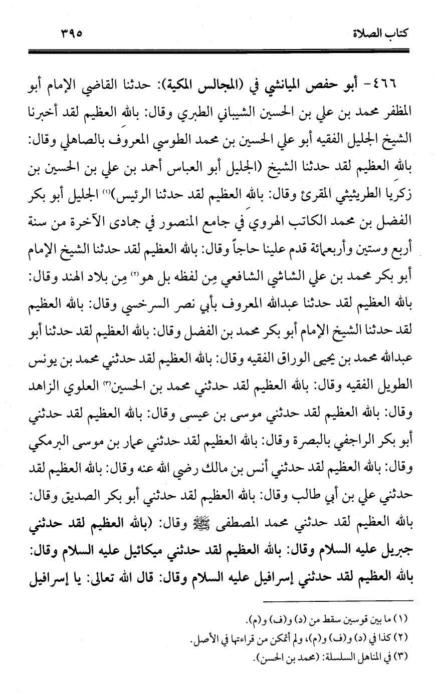 466 - أبو حفص الميانشي في (المجالس المكية): حدثنا القاضي الإمام أبو المظفر محمد بن علي بن الحسين الشيباني الطبري وقال: بالله العظيم لقد أخبرنا الشيخ الجليل الفقيه أبو علي الحسين بن محمد الطوسي المعروف بالصاهلي وقال: بالله العظيم لقد حدثنا الشيخ (الجليل أبو العباس أحمد بن علي بن الحسين بن زكرَيا الطريثيثي المقرئ وقال: باللهِ العظيم لقد حدثنا الرئيس) (¬1) الجليل أبو بكر الفضل بن محمد الكاتب الهروي في جامع المنصور في جمادى الآخرة من سنة أربع وستين وأربعمائة قدم علينا حاجاً وقال: بالله العظيم لقد حدثنا الشيخ الإمام أبو بكر محمد بن علي الشاشي الشافعي مِن لفظه بل هو (¬2) مِن بلاد الهند وقال: بالله العظيم لقد حدثنا عبد الله المعروف بأبي نصر السرخسي وقال: بالله العظيم لقد حدثنا الشيخ الإمام أبو بكر محمد بن الفضل وقال: بالله العظيم لقد حدثنا أبو عبد الله محمد بن يحيى الوراق الفقيه وقال: بالله العظيم لقد حدثني محمد بن يونس الطويل الفقيه وقال: بالله العظيم لقد حدثني محمد بن الحسين (¬3) العلوي الزاهد وقال: بالله العظيم لقد حدثني موسى بن عيسى وقال: بالله العظيم لقد حدثني أبو بكر الراجفي بالبصرة وقال: بالله العظيم لقد حدثني عمار بن موسى البرمكي وقال: بالله العظيم لقد حدثني أنس بن مالك رضي الله عنه وقال: بالله العظيم لقد حدثني علي بن أبي طالب وقال: بالله العظيم لقد حدثني أبو بكر الصديق وقال: بالله العظيم لقد حدثني محمد المصطفى - صلى الله عليه وسلم - وقال: (بالله العظيم لقد حدثني جبريل عليه السلام وقال: بالله العظيم لقد حدثني ميكائيل عليه السلام وقال: بالله العظيم لقد حدثني إسرافيل عليه السلام وقال: قال الله تعالى: يا إسرافيل