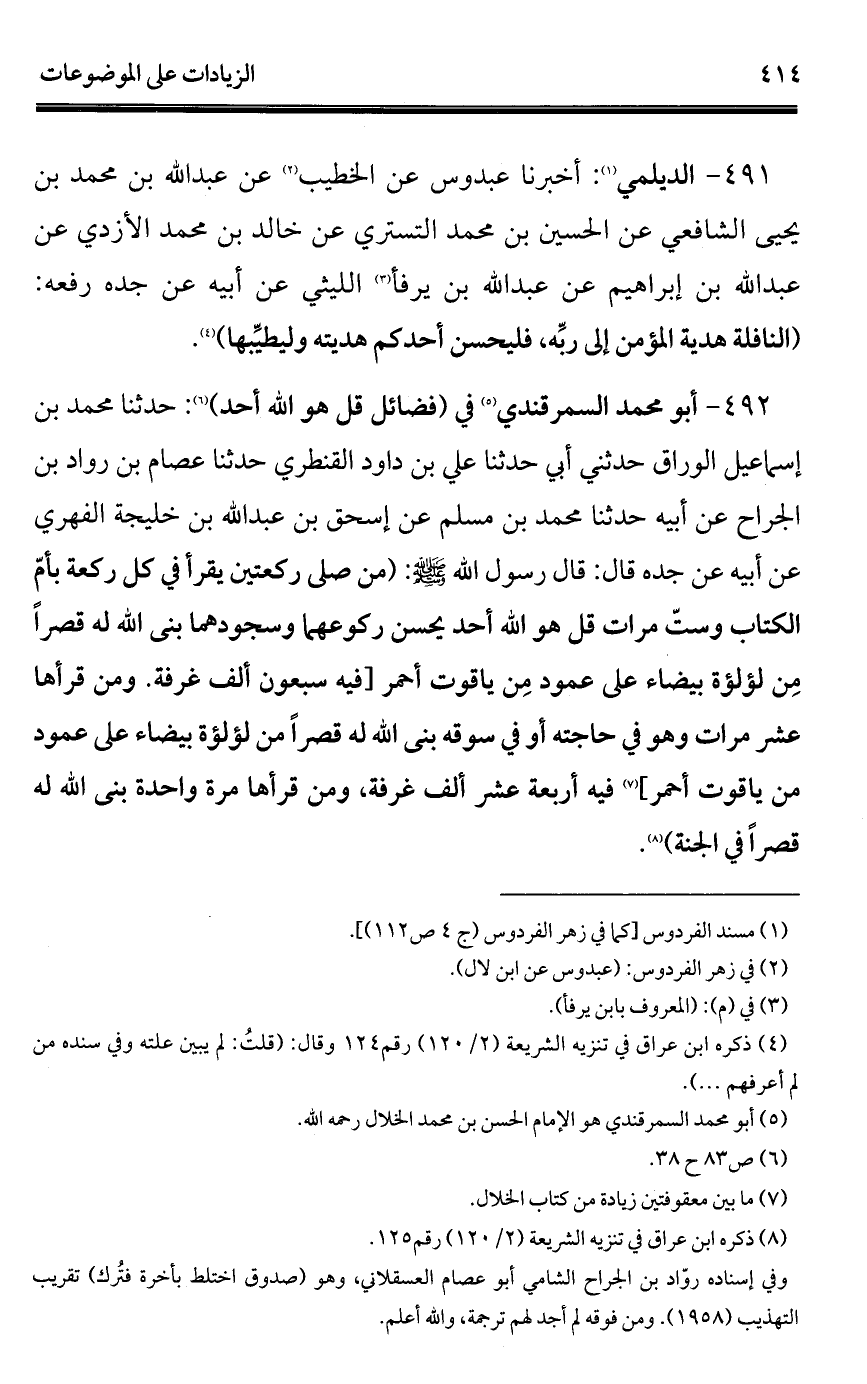 491 - الديلمي (¬1): أخبرنا عبدوس عن الخطيب (¬2) عن عبد الله بن محمد بن يحيى الشافعي عن الحسين بن محمد التستري عن خالد بن محمد الأزدي عن عبد الله بن إبراهيم عن عبد الله بن يرفأ (¬3) الليثي عن أبيه عن جده رفعه: (النافلة هدية المؤمن إلى ربِّه، فليحسن أحدكم هديته وليطيِّبها) (¬4).