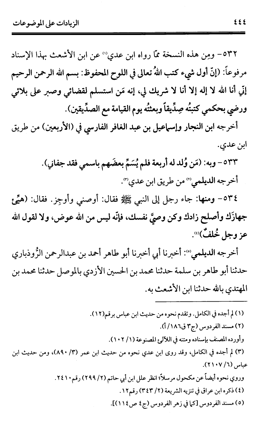532 - ومن هذه النسخة ممّا رواه ابن عدي (¬1) عن ابن الأشعث بهذا الإسناد مرفوعًا: (إنّ أول شيء كتب الله تعالى في اللوح المحفوظ: بِسْمِ اللَّهِ الرَّحْمَنِ الرَّحِيمِ إنّي أنا الله لا إله إلا أنا لا شريك لي، إنه مَن استسلم لقضائي وصبر على بلائي ورضي بحكمي كتبتُه صِدِّيقًا وبعثتُه يوم القيامة مع الصدِّيقين).