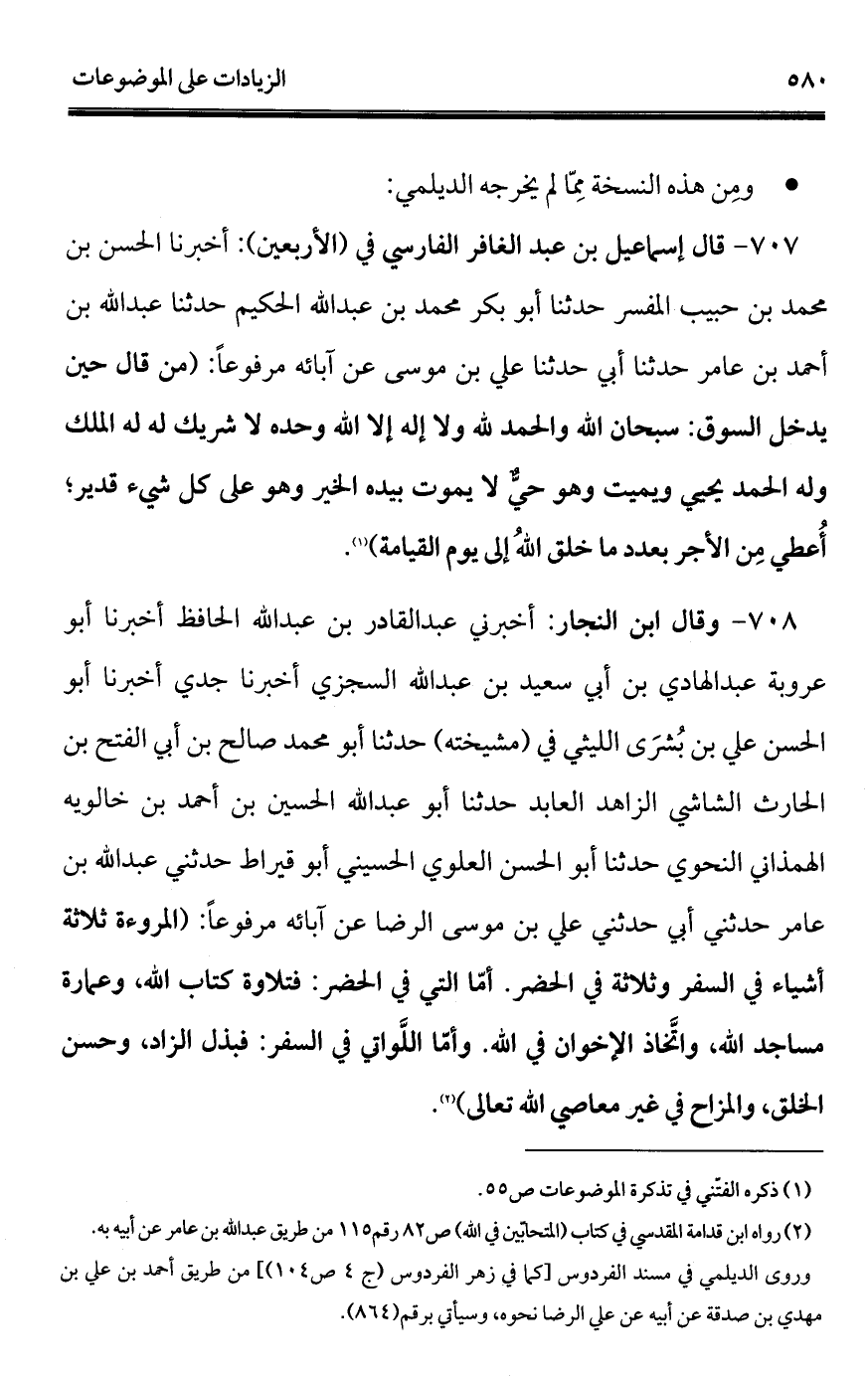 707 - قال إسماعيل بن عبد الغافر الفارسي في (الأربعين): أخبرنا الحسن بن محمد بن حبيب المفسر حدثنا أبو بكر محمد بن عبد الله الحكيم حدثنا عبد الله بن أحمد بن عامر حدثنا أبي حدثنا علي بن موسى عن آبائه مرفوعاً: (من قال حين يدخل السوق: سبحان الله والحمد لله ولا إله إلا الله وحده لا شريك له له الملك وله الحمد يحيي ويميت وهو حي لا يموت بيده الخير وهو على كل شيء قدير؛ أُعطي مِن الأجر بعدد ما خلق اللهُ إلى يوم القيامة) (¬1).