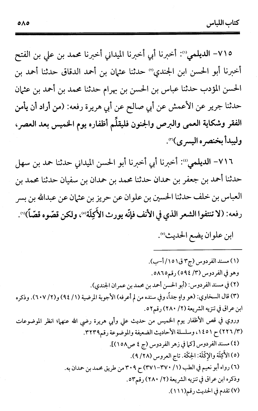 716 - الديلمي (¬1): أخبرنا أبي أخبرنا أبو الحسن الميداني حدثنا حمد بن سهل حدثنا أحمد بن جعفر بن حمدان حدثنا محمد بن حمدان بن سفيان حدثنا محمد بن العباس بن خلف حدثنا الحسين بن علوان عن حريز بن عثمان عن عبد الله بن بسر رفعه: (لا تنتفوا الشعر الذي في الأنف فإنّه يورث الأكِلَة (¬2)، ولكن قصّوه قصًّا) (¬3).