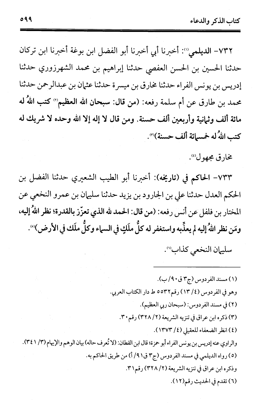 732 - الديلمي (¬1): أخبرنا أبي أخبرنا أبو الفضل ابن بوغة أخبرنا ابن تركان حدثنا الحسين بن الحسن العفصي حدثنا إبراهيم بن محمد الشهرزوري حدثنا إدريس بن يونس الفراء حدثنا مخارق بن ميسرة حدثنا عثمان بن عبد الرحمن حدثنا محمد بن طارق عن أم سلمة رفعه: (من قال: سبحان الله العظيم (¬2) كتب اللهُ له مائة ألف وثمانية وأربعين ألف حسنة. ومن قال لا إله إلا الله وحده لا شريك له كتب اللهُ له خمسمائة ألف حسنة) (¬3).