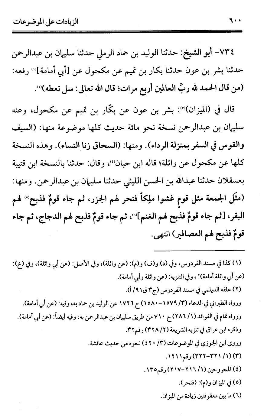 قال في (الميزان) (¬3): بشر بن عون عن بكّار بن تميم عن مكحول، وعنه سليمان بن عبد الرحمن نسخة نحو مائة حديث كلها موضوعة منها: (السيف والقوس في السفر بمنزلة الرداء). ومنها: (السحاق زنا النساء). وهذه النسخة كلها عن مكحول عن واثلة؛ قاله ابن حبان (¬4)، وقال: حدثنا بالنسخة ابن قتيبة بعسقلان حدثنا عبد الله بن الحسن الليثي حدثنا سليمان بن عبد الرحمن. ومنها: (مثَل الجمعة مثل قومٍ غشوا ملِكًا فنحر لهم الجزر، ثم جاء قومٌ فذبح (¬5) لهم البقر، [ثم جاء قومٌ فذبح لهم الغنم] (¬6)، ثم جاء قومٌ فذبح لهم الدجاج، ثم جاء قومٌ فذبح لهم العصافير) انتهى.