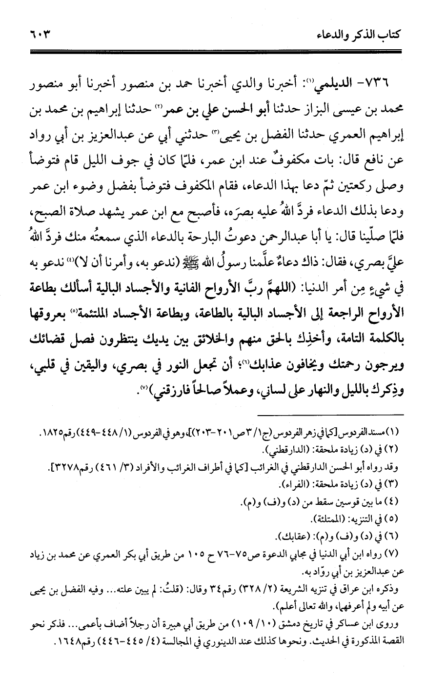 736 - الديلمي (¬1): أخبرنا والدي أخبرنا حمد بن منصور أخبرنا أبو منصور محمد بن عيسى البزاز حدثنا أبو الحسن علي بن عمر (¬2) حدثنا إبراهيم بن محمد بن إبراهيم العمري حدثنا الفضل بن يحيى (¬3) حدثني أبي عن عبد العزيز بن أبي رواد عن نافع قال: بات مكفوفٌ عند ابن عمر، فلمّا كان في جوف الليل قام فتوضأ وصلى ركعتين ثمّ دعا بهذا الدعاء، فقام المكفوف فتوضأ بفضل وضوء ابن عمر ودعا بذلك الدعاء فردَّ اللهُ عليه بصرَه، فأصبح مع ابن عمر يشهد صلاة الصبح، فلمّا صلّينا قال: يا أبا عبد الرحمن دعوتُ البارحة بالدعاء الَّذي سمعتُه منك فردَّ اللهُ عليَّ بصري، فقال: ذاك دعاءٌ علَّمنا رسولُ الله - صلى الله عليه وسلم - (ندعو به، وأمرنا أن لا) (¬4) ندعو به في شيءٍ مِن أمر الدنيا: (اللهمَّ ربَّ الأرواح الفانية والأجساد البالية أسألك بطاعة الأرواح الراجعة إلى الأجساد البالية بالطاعة، وبطاعة الأجساد الملتئمة (¬5) بعروقها بالكلمة التامة، وأخذِك بالحق منهم والخلائق بين يديك ينتظرون فصل قضائك ويرجون رحمتك ويخافون عذابك (¬6)، أن تجعل النور في بصري، واليقين في قلبي، وذِكرك بالليل والنهار على لساني، وعملًا صالحًا فارزقني) (¬7).