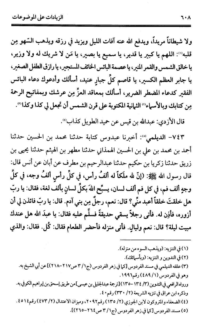 743 - الديلمي (¬1): أخبرنا عبدوس كتابة حدثنا محمد بن الحسين حدثنا أحمد بن محمد بن علي بن الحسين الهمذاني حدثنا مطهر بن الهيثم حدثنا يحيى بن زريق حدثنا زكريا بن حكيم حدثنا عبد الرحيم بن مطرف عن أبان عن أنس قال: قال رسول الله - صلى الله عليه وسلم -: (إنّ لله ملكًا له ألفُ رأس، في كلِّ رأسٍ ألفُ وجه، في كلِّ وجهٍ ألف فم، في كل فم ألف لسان، يسبِّح اللهَ بكلِّ لسانٍ بألف لغة، فقال: يا ربّ هل خلقتَ خلقًا أعبد منِّي؟ قال: نعم، رجل مِن بني آدم. قال: يا ربّ فائذن لي أن أزوره، فأذِن له. فأتى رجلًا يسقي حديقةً فسلَّم عليه فقال: يا عبدَ الله هل عندك مبيت ليلة؟ قال: نعم وليالٍ. فأتى منزله فأحضر الطعام فقال: كُل. فقال: والذي