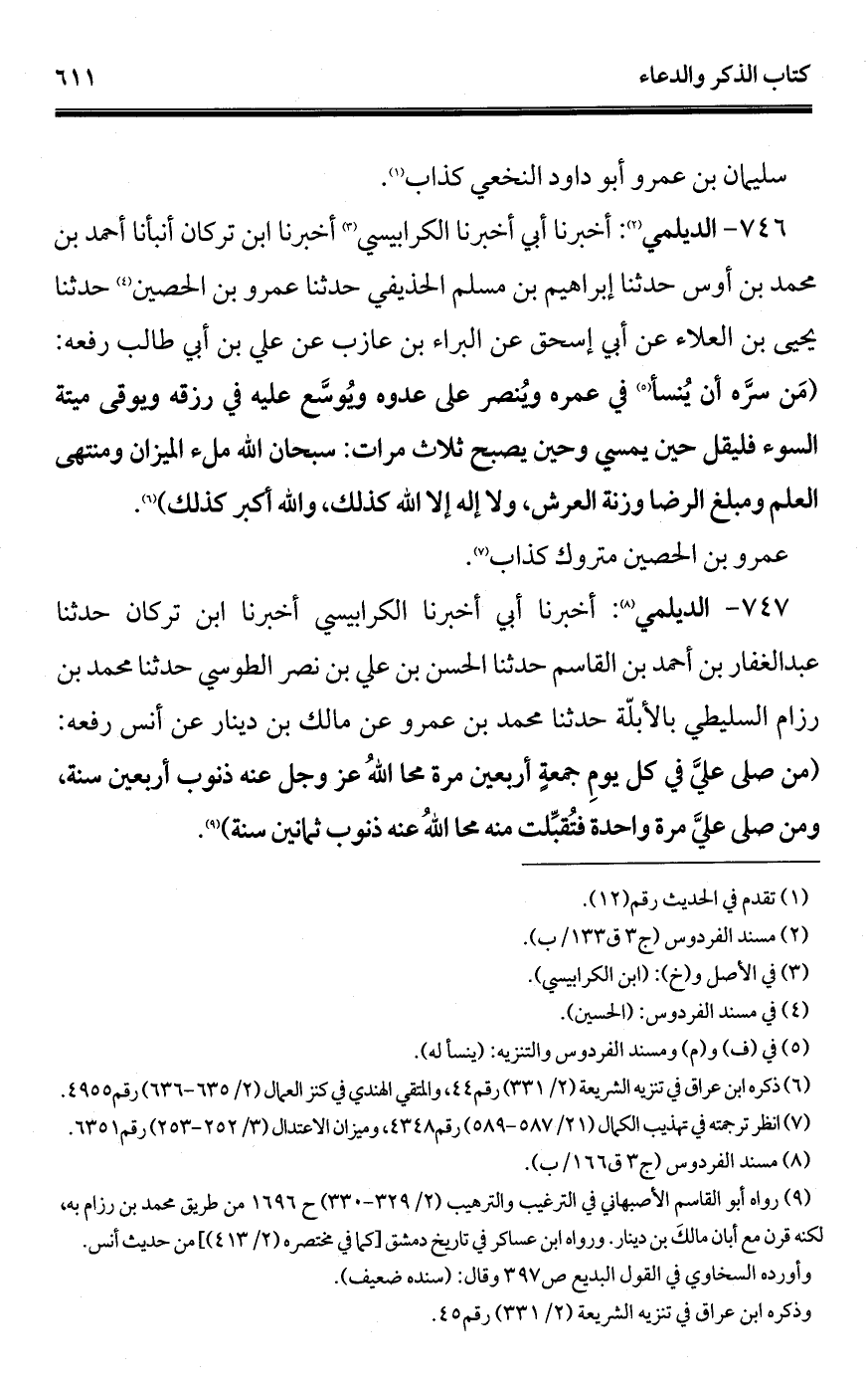 746 - الديلمي (¬1): أخبرنا أبي أخبرنا الكرابيسي (¬2) أخبرنا ابن تركان أنبأنا أحمد بن محمد بن أوس حدثنا إبراهيم بن مسلم الحذيفي حدثنا عمرو بن الحصين (¬3) حدثنا يحيى بن العلاء عن أبي إسحاق عن البراء بن عازب عن علي بن أبي طالب رفعه: (مَن سرَّه أن يُنسأ (¬4) في عمره ويُنصر على عدوه ويُوسَّع عليه في رزقه ويوقى ميتة السوء فليقل حين يمسي وحين يصبح ثلاث مرات: سبحان الله ملء الميزان ومنتهى العلم ومبلغ الرضا وزنة العرش، ولا إله إلا الله كذلك، والله أكبر كذلك) (¬5).