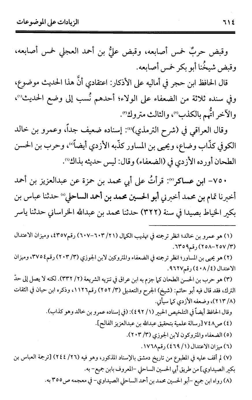 750 - ابن عساكر (¬1): قرأتُ على أبي محمد بن حمزة عن عبد العزيز بن أحمد أخبرنا تمام بن محمد أخبرني أبو الحسين محمد بن أحمد الساحلي (¬2) حدثنا عباس بن بكير الخياط بصيدا في سنة (322) حدثنا محمد بن عبد الله الخراساني حدثنا ياسر
