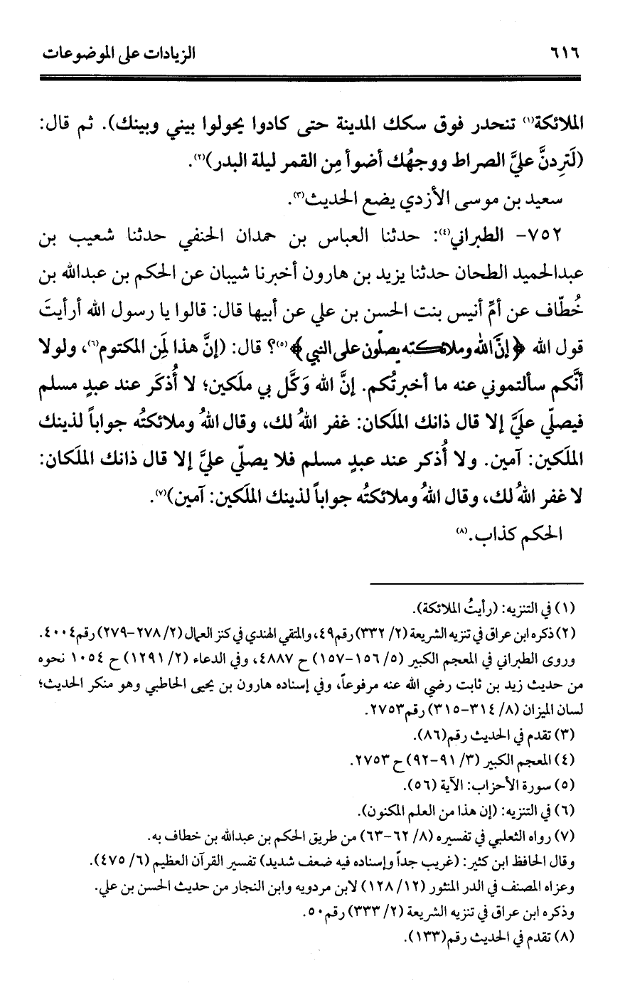 752 - الطبراني (¬1): حدثنا العباس بن حمدان الحنفي حدثنا شعيب بن عبد الحميد الطحان حدثنا يزيد بن هارون أخبرنا شيبان عن الحكم بن عبد الله بن خُطّاف عن أمِّ أنيس بنت الحسن بن علي عن أبيها قال: قالوا يا رسول الله أرأيتَ قول الله {إِنَّ اللَّهَ وَمَلَائِكَتَهُ يُصَلُّونَ عَلَى النَّبِيِّ} (¬2)؟ قال: (إنَّ هذا لَمِن المكتوم (¬3)، ولولا أنَّكم سألتموني عنه ما أخبرتُّكم. إنَّ الله وَكَّل بي ملَكين؛ لا أُذكَر عند عبدٍ مسلم فيصلّي علَيَّ إلا قال ذانك الملَكان: غفر اللهُ لك، وقال اللهُ وملائكتُه جوابًا لذينك الملَكين: آمين. ولا أُذكر عند عبدٍ مسلم فلا يصلّي عليَّ إلا قال ذانك الملَكان: لا غفر اللهُ لك، وقال اللهُ وملائكتُه جوابًا لذينك الملكين: آمين) (¬4).