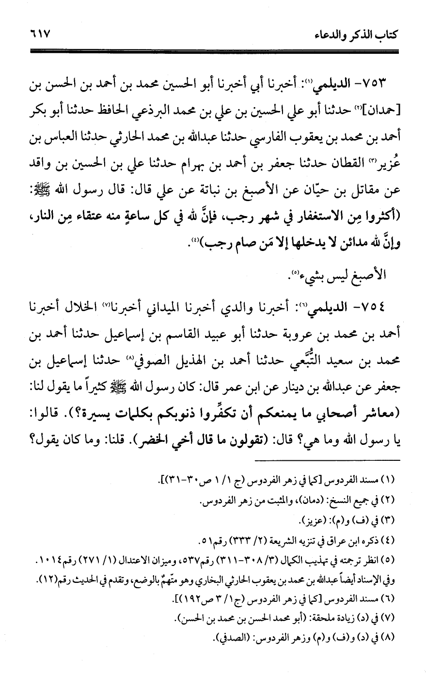 753 - الديلمي (¬1): أخبرنا أبي أخبرنا أبو الحسين محمد بن أحمد بن الحسن بن [حمدان] (¬2) حدثنا أبو علي الحسين بن علي بن محمد البرذعي الحافظ حدثنا أبو بكر أحمد بن محمد بن يعقوب الفارسي حدثنا عبد الله بن محمد الحارثي حدثنا العباس بن عُزير (¬3) القطان حدثنا جعفر بن أحمد بن بهرام حدثنا علي بن الحسين بن واقد عن مقاتل بن حيّان عن الأصبغ بن نباتة عن علي قال: قال رسول الله - صلى الله عليه وسلم -: (أكثروا مِن الاستغفار في شهر رجب، فإنَّ لله في كل ساعةٍ منه عتقاء مِن النار، وإنَّ لله مدائن لا يدخلها إلا مَن صام رجب) (¬4).
