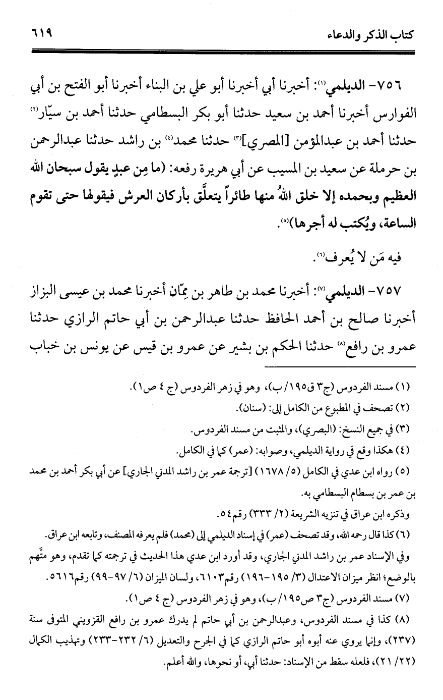 756 - الديلمي (¬1): أخبرنا أبي أخبرنا أبو علي بن البناء أخبرنا أبو الفتح بن أبي الفوارس أخبرنا أحمد بن سعيد حدثنا أبو بكر البسطامي حدثنا أحمد بن سيّار (¬2) حدثنا أحمد بن عبد المؤمن [المصري] (¬3) حدثنا محمد (¬4) بن راشد حدثنا عبد الرحمن بن حرملة عن سعيد بن المسيب عن أبي هريرة رفعه: (ما مِن عبدٍ يقول سبحان الله العظيم وبحمده إلا خلق اللهُ منها طائرًا يتعلَّق بأركان العرش فيقولها حتَّى تقوم الساعة، ويُكتب له أجرها) (¬5).