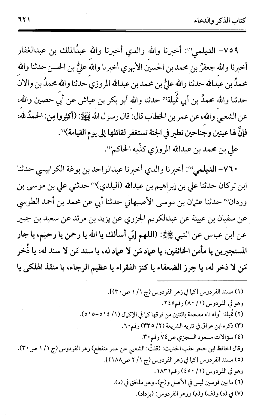 759 - الديلمي (¬1): أخبرنا والله والدي أخبرنا والله عبدُ الملك بن عبد الغفار أخبرنا والله جعفرُ بن محمد بن الحسيَن الأبهري أخبرنا واللهَ عليُّ بن الحسن حدثنا والله محمدُ بن عبَد الله حدثنا والله عليُّ بن محمد بن عبد الله المروزي حدثنا والله محمدُ بن والانَ حدثنا والله محمدُ بن أبي تُمَيلة (¬2) حدثنا والله أبو بكر بن عياش عن أبَي حصين واللهِ، عن الشعبيَ والله، عن عمر بن الخطاب قال. قال رسول الله - صلى الله عليه وسلم -: (أكثِروا مِن: الحمدُ لله، فإنَّ لها عينين وجَناحين تطير في الجنّة تستغفر لقائلها إلى يوم القيامة) (¬3).