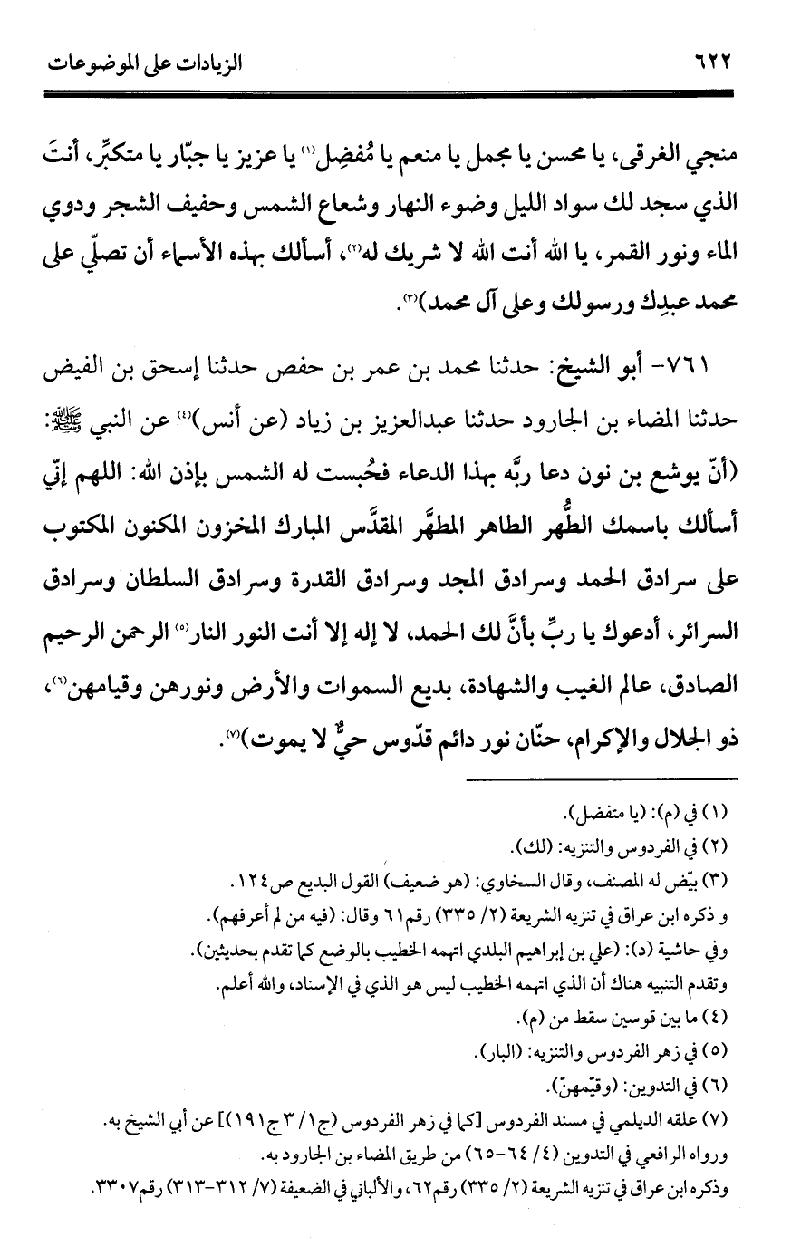 761 - أبو الشيخ: حدثنا محمد بن عمر بن حفص حدثنا إسحاق بن الفيض حدثنا المضاء بن الجارود حدثنا عبد العزيز بن زياد (عن أنس) (¬1) عن النبي - صلى الله عليه وسلم -: (أنّ يوشع بن نون دعا ربَّه بهذا الدعاء فحُبست له الشمس بإذن الله: اللهم إنّي أسألك باسمك الطُّهر الطاهر المطهَّر المقدَّس المبارك المخزون المكنون المكتوب على سرادق الحمد وسرادق المجد وسرادق القدرة وسرادق السلطان وسرادق السرائر، أدعوك يا ربِّ بأنَّ لك الحمد، لا إله إلا أنت النور النار (¬2) الرحمن الرحيم الصادق، عالم الغيب والشهادة، بديع السموات والأرض ونورهن وقيامهن (¬3)، ذو الجلال والإكرام، حنّان نور دائم قدّوس حيٌّ لا يموت) (¬4).