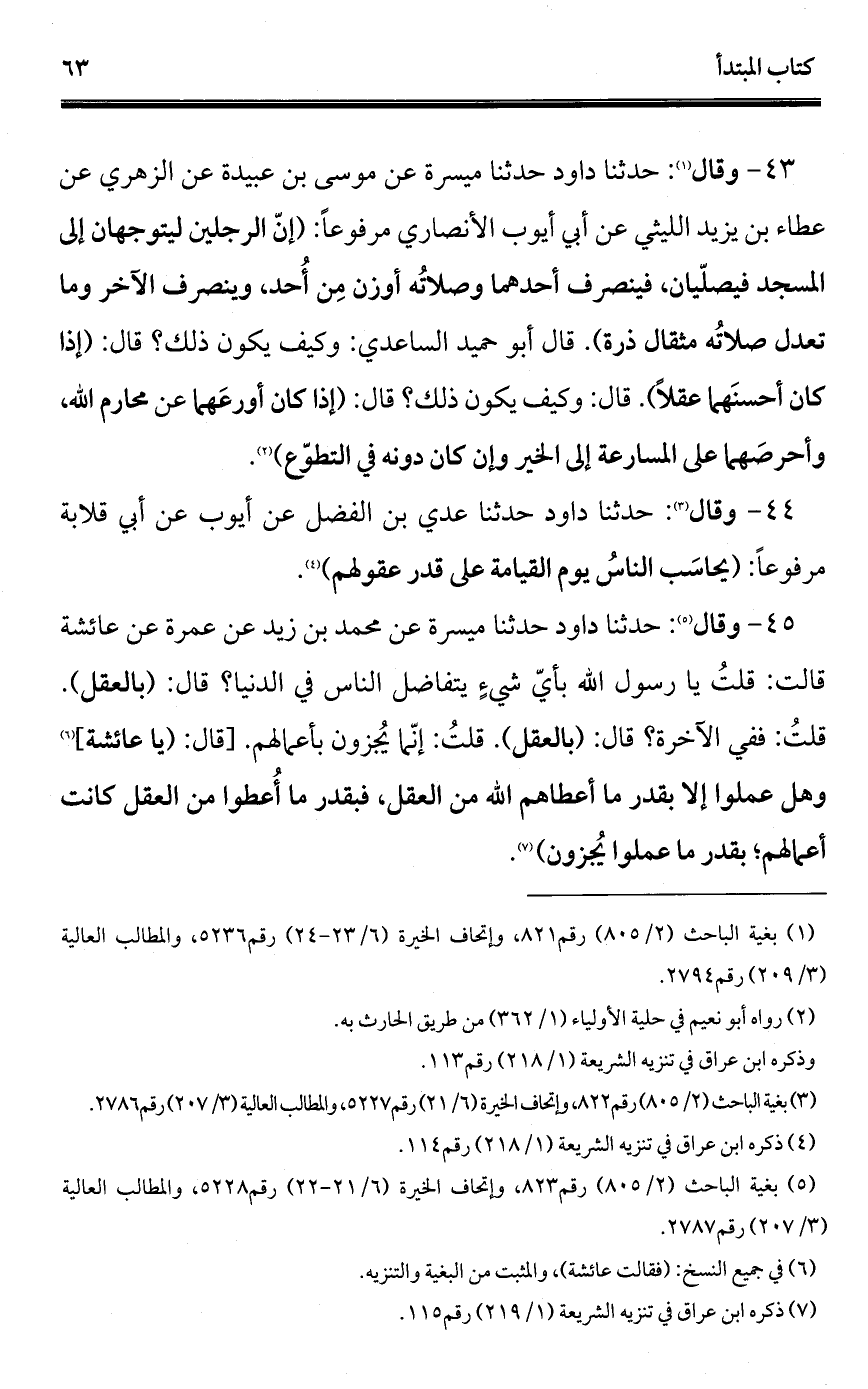 44 - وقال (¬1): حدثنا داود حدثنا عدي بن الفضل عن أيوب عن أبي قلابة مرفوعًا: (يحاسَب الناسُ يوم القيامة على قدر عقولهم) (¬2).
