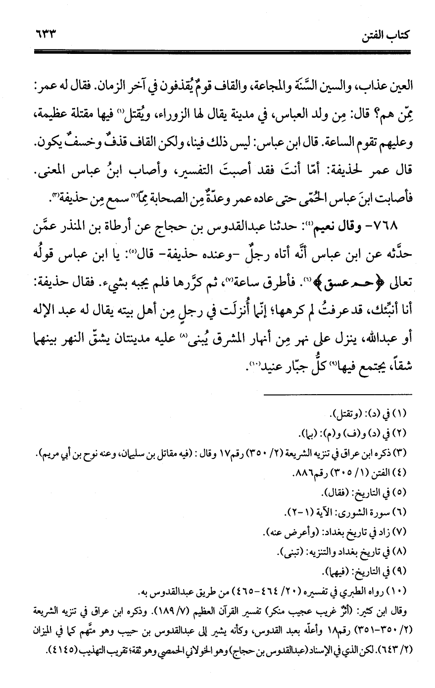 768 - وقال نعيم (¬1): حدثنا عبد القدوس بن حجاج عن أرطاة بن المنذر عمَّن حدَّثه عن ابن عباس أنَّه أتاه رجلٌ - وعنده حذيفة - قال (¬2): يا ابن عباس قولُه تعالى {حم عسق} (¬3). فأطرق ساعة (¬4)، ثم كرَّرها فلم يجبه بشيء. فقال حذيفة: أنا أنبِّئك، قد عرفتُ لم كرهها، إنّما أُنزلَت في رجلٍ مِن أهل بيته يقال له عبد الإله أو عبد الله، ينزل على نهر مِن أنهار المشرق يُبنى (¬5) عليه مدينتان يشقّ النهر بينهما شقًا، يجتمع فيها (¬6) كلُّ جبّار عنيد (¬7).