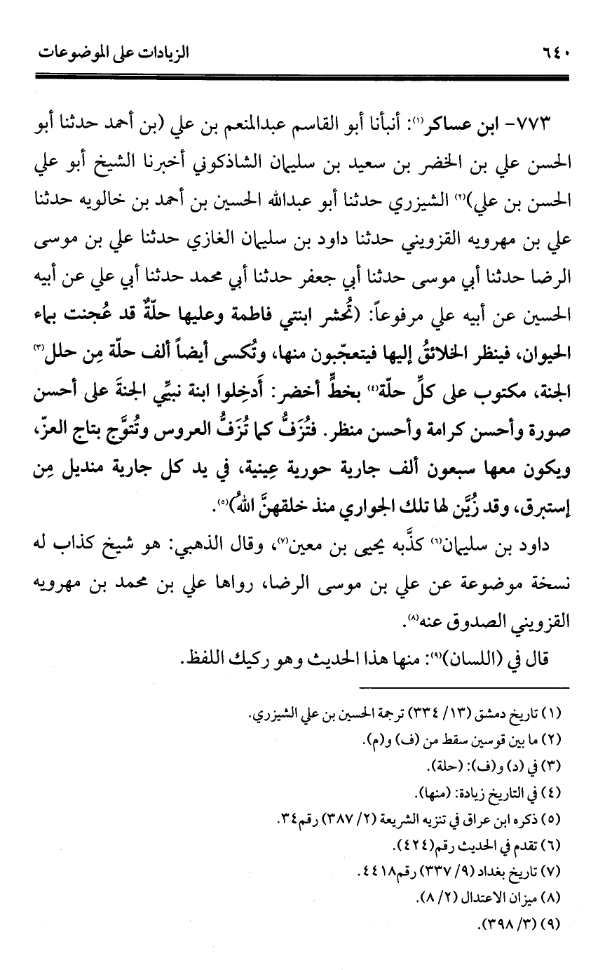 773 - ابن عساكر (¬1): أنبأنا أبو القاسم عبد المنعم بن علي (بن أحمد حدثنا أبو الحسن علي بن الخضر بن سعيد بن سليمان الشاذكوني أخبرنا الشيخ أبو علي الحسن بن علي) (¬2) الشيزري حدثنا أبو عبد الله الحسين بن أحمد بن خالويه حدثنا علي بن مهرويه القزويني حدثنا داود بن سليمان الغازي حدثنا علي بن موسى الرضا حدثنا أبي موسى حدثنا أبي جعفر حدثنا أبي محمد حدثنا أبي علي عن أبيه الحسين عن أبيه علي مرفوعًا: (تُحشر ابنتي فاطمة وعليها حلّةٌ قد عُجنت بماء الحيوان، فينظر الخلائقُ إليها فيتعجّبون منها، وتُكسى أيضًا ألف حلّة مِن حلل (¬3) الجنّة، مكتوب على كلِّ حلّة (¬4) بخطٍّ أخضر: أَدخِلوا ابنة نبيِّيِّ الجنّةَ على أحسن صورة وأحسن كرامة وأحسن منظر. فتُزَفُّ كما تُزَفُّ العروس وتُتوَّج بتاج العزّ، ويكون معها سبعون ألف جارية حورية عِينية، في يد كل جارية منديل مِن إستبرق، وقد زُيَّن لها تلك الجواري منذ خلقهنَّ اللهُ) (¬5).