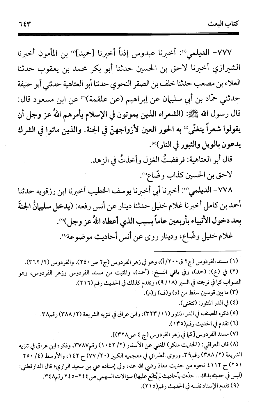 777 - الديلمي (¬1): أخبرنا عبدوس إذنًا أخبرنا [حميد] (¬2) بن المأمون أخبرنا الشيرازي أخبرنا لاحق بن الحسين حدثنا أبو بكر محمد بن يعقوب حدثنا العلاء بن مصعب حدثنا خلف بن الصقر النحوي حدثنا أبو العتاهية حدثني أبو حنيفة حدثني حمّاد بن أبي سليمان عن إبراهيم (عن علقمة) (¬3) عن ابن مسعود قال: قال رسول الله - صلى الله عليه وسلم -: (الشعراء الذين يموتون في الإسلام يأمرهم اللهُ عز وجل أن يقولوا شعرًا يتغنّى (¬4) به الحور العين لأزواجهنّ في الجنّة. والذين ماتوا في الشرك يدعون بالويل والثبور في النار) (¬5).