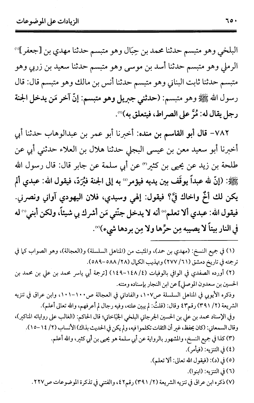 782 - قال أبو القاسم بن منده: أخبرنا أبو عمر بن عبد الوهاب حدثنا أبي أخبرنا أبو سعيد معن بن عيسى البجلي حدثنا هلال بن العلاء حدثني أبي عن طلحة بن زيد عن يحيى بن كثير (¬1) عن أبي سلمة عن جابر قال: قال رسول الله - صلى الله عليه وسلم -: (إنّ لله عبدًا يوقَف بين يديه فيؤمر (¬2) به إلى الجنّة فيُرَدّ، فيقول الله: عبدي ألم يكن لك أخٌ وأخاك فيَّ؟ فيقول: إلهي وسيدي، فلان اليهودي آواني ونصرني. فيقول الله: عبدي ألا تعلم (¬3) أنَّه لا يدخل جنّتي مَن أشرك بي شيئًا، ولكن أبني (¬4) له في النار بيتًا لا يصيبه مِن حرِّها ولا مِن بردها شيء) (¬5).