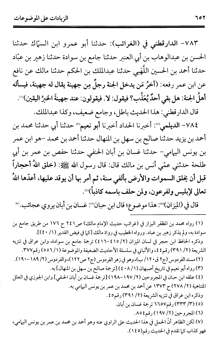 783 - الدارقطني في (الغرائب): حدثنا أبو عمرو ابن السمّاك حدثنا الحسن بن عبد الوهاب بن أبي العنبر حدثنا جامع بن سوادة حدثنا زهير بن عبّاد حدثنا أحمد بن الحسين اللَّهَبي حدثنا عبد الملك بن الحكم حدثنا مالك عن نافع عن ابن عمر رفعه: (آخرُ مَن يدخل الجنة رجلٌ مِن جهينة يقال له جهينة، فيسأله أهلُ الجنة: هل بقي أحدٌ يُعَذَّب؟ فيقول: لا. فيقولون: عند جهينةَ الخبرُ اليقين) (¬1).
