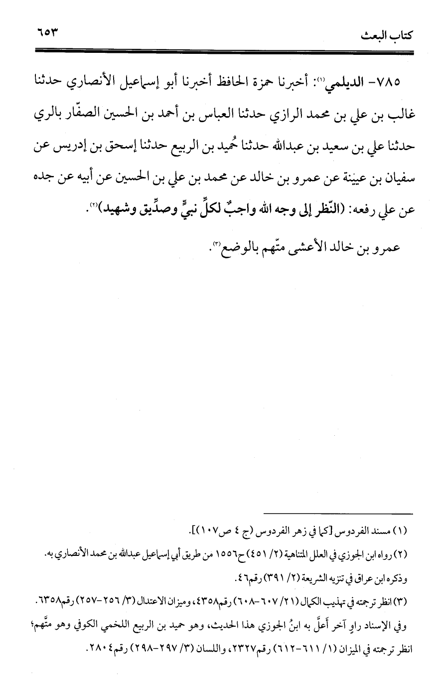 785 - الديلمي (¬1): أخبرنا حمزة الحافظ أخبرنا أبو إسماعيل الأنصاري حدثنا غالب بن علي بن محمد الرازي حدثنا العباس بن أحمد بن الحسين الصفّار بالري حدثنا علي بن سعيد بن عبد الله حدثنا حُميد بن الربيع حدثنا إسحاق بن إدريس عن سفيان بن عيينة عن عمرو بن خالد عن محمد بن علي بن الحسين عن أبيه عن جده عن علي رفعه: (النّظر إلى وجه الله واجب لكلِّ نبيٍّ وصدِّيق وشهيد) (¬2).