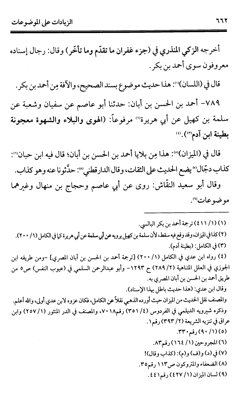 789 - أحمد بن الحسن بن أبان: حدثنا أبو عاصم عن سفيان وشعبة عن سلمة بن كهيل عن أبي هريرة (¬1) مرفوعاً: (الهوى والبلاء والشهوة معجونة بطينة ابن آدم) (¬2). (¬3)