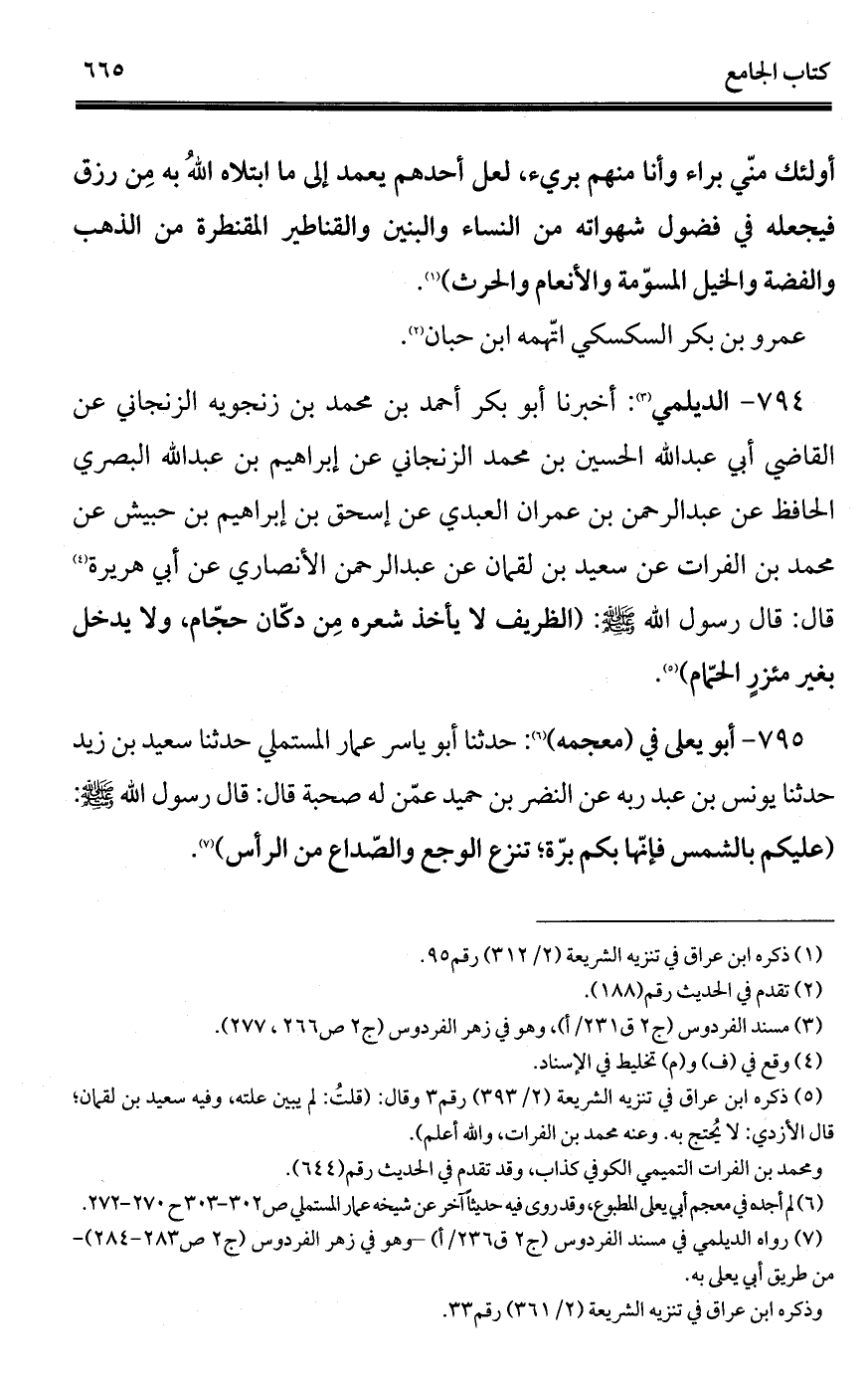 794 - الديلمي (¬1): أخبرنا أبو بكر أحمد بن محمد بن زنجويه الزنجاني عن القاضي أبي عبد الله الحسين بن محمد الزنجاني عن إبراهيم بن عبد الله البصري الحافظ عن عبد الرحمن بن عمران العبدي عن إسحاق بن إبراهيم بن حبيش عن محمد بن الفرات عن سعيد بن لقمان عن عبد الرحمن الأنصاري عن أبي هريرة (¬2) قال: قال رسول الله - صلى الله عليه وسلم -: (الظريف لا يأخذ شعره مِن دكّان حجّام، ولا يدخل بغير مئزرٍ الحمّام) (¬3).