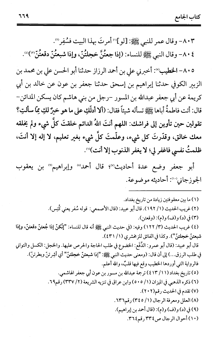 805 - الخطيب (¬1): أخبرني علي بن أحمد الرزاز حدثنا أبو الحسن علي بن محمد بن الزبير الكوفي حدثنا إبراهيم بن إسحاق حدثنا جعفر بن عون عن خالد بن أبي كريمة عن أبي جعفر عبد الله بن المسور -رجل من بني هاشم كان يسكن المدائن- قال: أتت فاطمةُ أباها - صلى الله عليه وسلم - تسأله شيئاً فقال: (ألا أدلّكِ على ما هو خير لكِ مِمّا سألتِ؟ تقولين حين تأوين إلى فراشك: اللهم أنتَ اللهُ الدائم خلقتَ كلَّ شيء ولم يخلقه معك خالق، وقدّرتَ كل شيء، وعلّمتَ كل شيء بغير تعليم، لا إله إلا أنتَ، ظلمتُ نفسي فاغفر لي؛ لا يغفر الذنوب إلا أنت) (¬2).