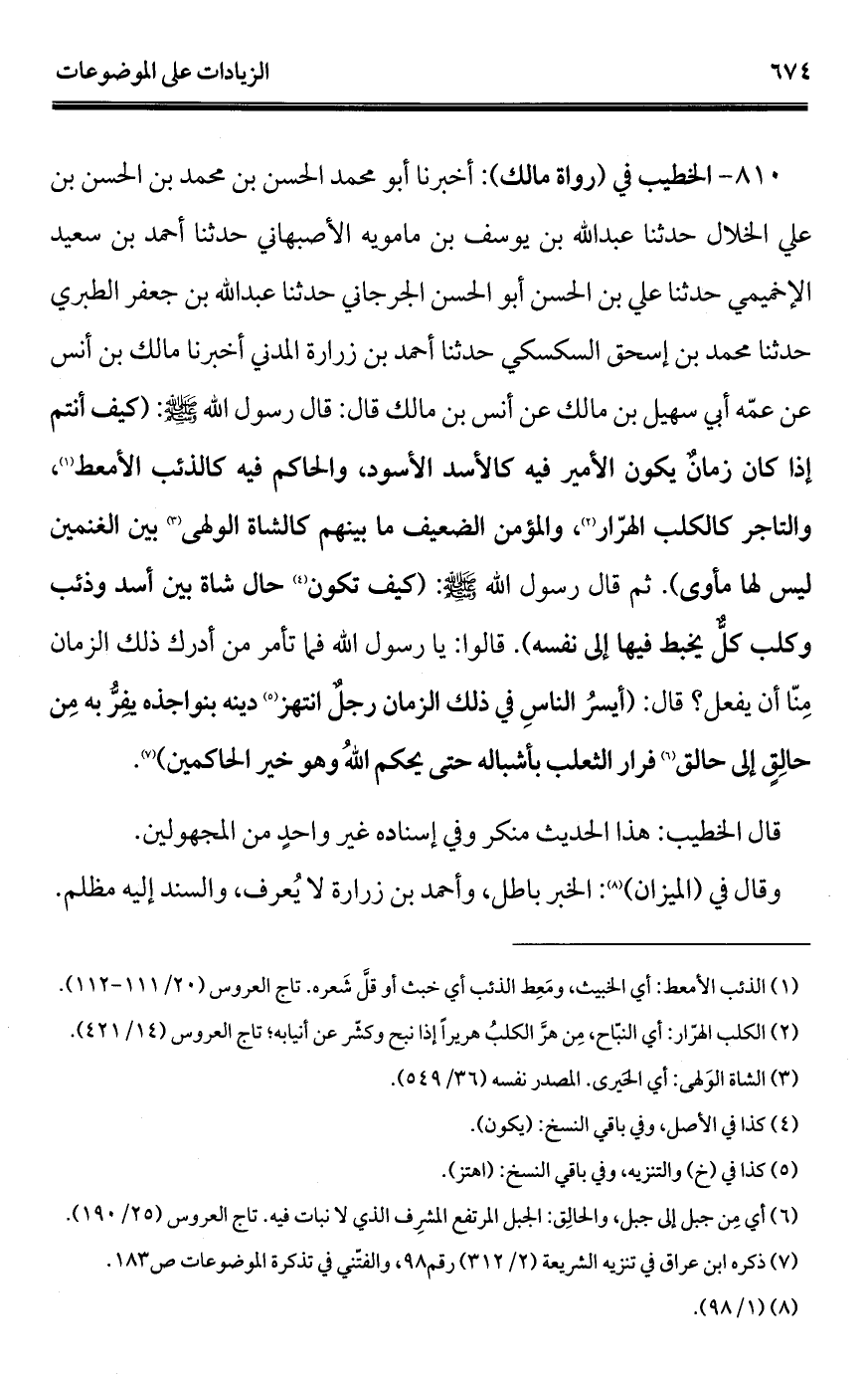 810 - الخطيب في (رواة مالك): أخبرنا أبو محمد الحسن بن محمد بن الحسن بن علي الخلال حدثنا عبد الله بن يوسف بن مامويه الأصبهاني حدثنا أحمد بن سعيد الإخميمي حدثنا علي بن الحسن أبو الحسن الجرجاني حدثنا عبد الله بن جعفر الطبري حدثنا محمد بن إسحاق السكسكي حدثنا أحمد بن زرارة المدني أخبرنا مالك بن أنس عن عمّه أبي سهيل بن مالك عن أنس بن مالك قال: قال رسول الله - صلى الله عليه وسلم -: (كيف أنتم إذا كان زمانٌ يكون الأمير فيه كالأسد الأسود، والحاكم فيه كالذئب الأمعط (¬1)، والتاجر كالكلب الهرّار (¬2)، والمؤمن الضعيف ما بينهم كالشاة الولهى (¬3) بين الغنمين ليس لها مأوى). ثم قال رسول الله - صلى الله عليه وسلم -: (كيف تكون (¬4) حال شاة بين أسد وذئب وكلب كل يخبط فيها إلى نفسه). قالوا: يا رسول الله فما تأمر من أدرك ذلك الزمان مِنّا أن يفعل؟ قال: (أيسرُ الناسِ في ذلك الزمان رجلٌ انتهز (¬5) دينه بنواجذه يفرُّ به مِن حالِقٍ إلى حالق (¬6) فرار الثعلب بأشباله حتى يحكم اللهُ وهو خير الحاكمين) (¬7).