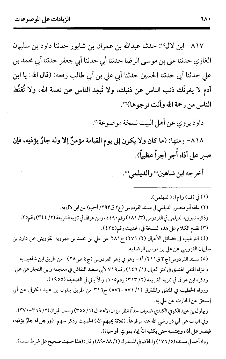 817 - ابن لال (¬1): حدثنا عبد الله بن عمران بن شابور حدثنا داود بن سليمان الغازي حدثنا علي بن موسى الرضا حدثنا أبي حدثنا أبي جعفر حدثنا أبي محمد بن علي حدثنا أبي حدثنا الحسين حدثنا أبي علي بن أبي طالب رفعه: (قال الله: يا ابن آدم لا يغرنّك ذنب الناس عن ذنبك، ولا تُبعِد الناس عن نعمة الله، ولا تُقنِّط الناس من رحمة الله وأنت ترجوها) (¬2).