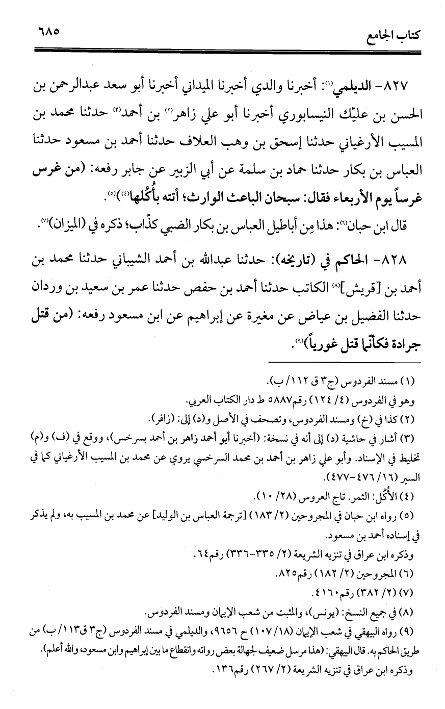 827 - الديلمي (¬1): أخبرنا والدي أخبرنا الميداني أخبرنا أبو سعد عبد الرحمن بن الحسن بن عليّك النيسابوري أخبرنا أبو علي زاهر (¬2) بن أحمد (¬3) حدثنا محمد بن المسيب الأرغياني حدثنا إسحاق بن وهب العلاف حدثنا أحمد بن مسعود حدثنا العباس بن بكار حدثنا حماد بن سلمة عن أبي الزبير عن جابر رفعه: (من غرس غرساً يوم الأربعاء فقال: سبحان الباعث الوارث؛ أتته بأُكُلها) (¬4) (¬5).