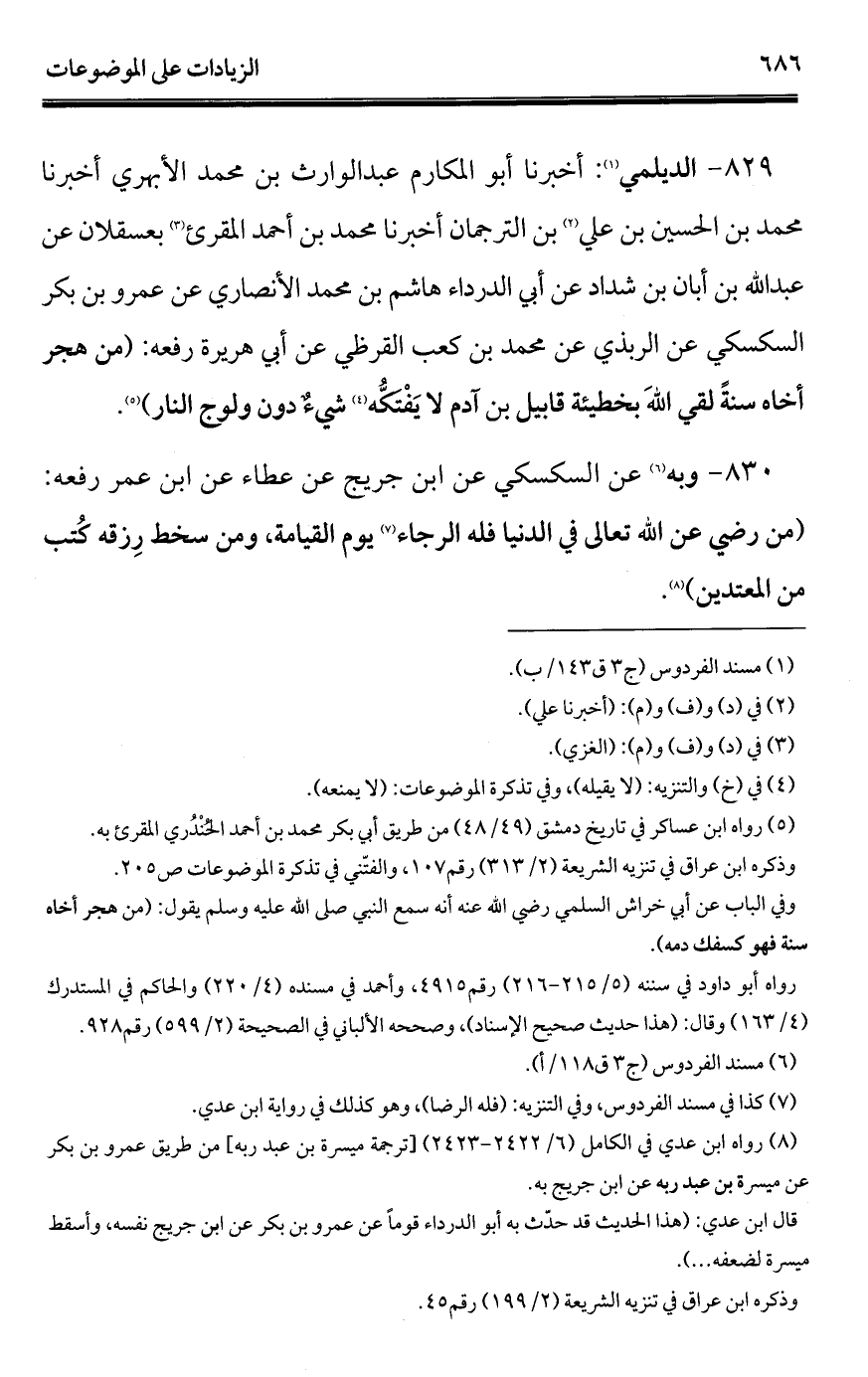 829 - الديلمي (¬1): أخبرنا أبو المكارم عبد الوارث بن محمد الأبهري أخبرنا محمد بن الحسين بن علي (¬2) بن الترجمان أخبرنا محمد بن أحمد المقرئ (¬3) بعسقلان عن عبد الله بن أبان بن شداد عن أبي الدرداء هاشم بن محمد الأنصاري عن عمرو بن بكر السكسكي عن الربذي عن محمد بن كعب القرظي عن أبي هريرة رفعه: (من هجر أخاه سنةً لقي الله بخطيئة قابيل بن آدم لا يَفْتكُّه (¬4) شيءٌ دون ولوج النار) (¬5).