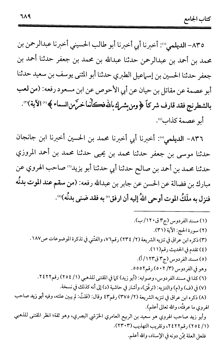 835 - الديلمي (¬1): أخبرنا أبي أخبرنا أبو طالب الحسيني أخبرنا عبد الرحمن بن محمد بن أحمد بن عبد الرحمن حدثنا عبد الله بن محمد بن جعفر حدثنا أحمد بن جعفر حدثنا الحسين بن إسماعيل الطبري حدثنا أبو المثنى يوسف بن سعيد حدثنا أبو عصمة عن مقاتل بن حيان عن أبي الأحوص عن ابن مسعود رفعه: (من لعب بالشطرنج فقد قارف شركاً (ومن يشرك بالله فكأنما خرّ من السماء} (¬2) الآية) (¬3).
