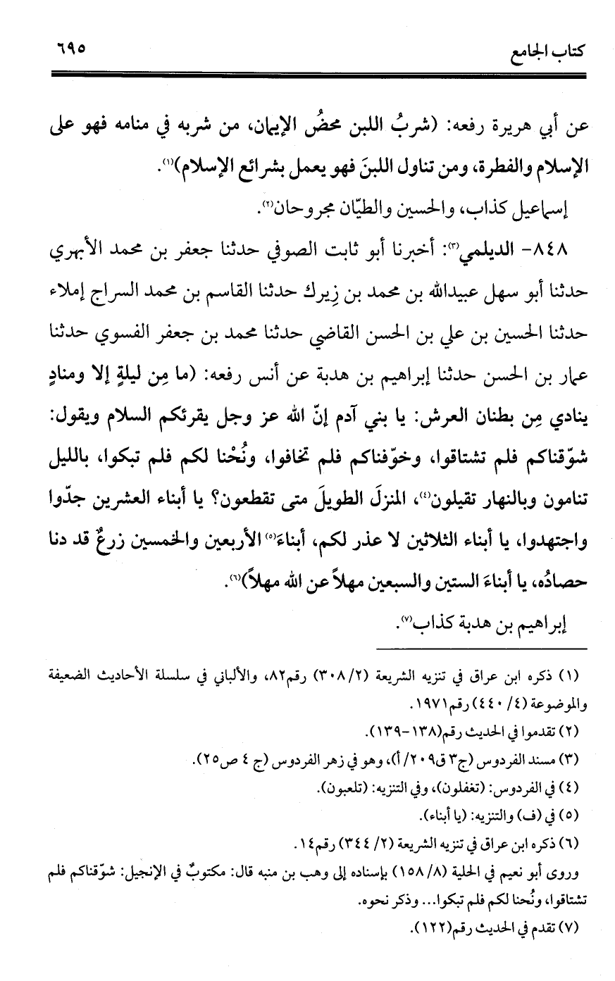 848 - الديلمي (¬1): أخبرنا أبو ثابت الصوفي حدثنا جعفر بن محمد الأبهري حدثنا أبو سهل عبيد الله بن محمد بن زِيرك حدثنا القاسم بن محمد السراج إملاء حدثنا الحسين بن علي بن الحسن القاضي حدثنا محمد بن جعفر الفسوي حدثنا عمار بن الحسن حدثنا إبراهيم بن هدبة عن أنس رفعه: (ما مِن ليلة إلا ومنادٍ ينادي مِن بطنان العرش: يا بني آدم إنّ الله عز وجل يقرئكم السلام ويقول: شوّقناكم فلم تشتاقوا، وخوّفناكم فلم تخافوا، ونُحْنا لكم فلم تبكوا، بالليل تنامون وبالنهار تقيلون (¬2)، المنزلَ الطويلَ متى تقطعون؟ يا أبناء العشرين جدّوا واجتهدوا، يا أبناء الثلاثين لا عذر لكم، أبناءَ (¬3) الأربعين والخمسين زرعٌ قد دنا حصادُه، يا أبناءَ الستين والسبعين مهلاً عن الله مهلاً) (¬4).