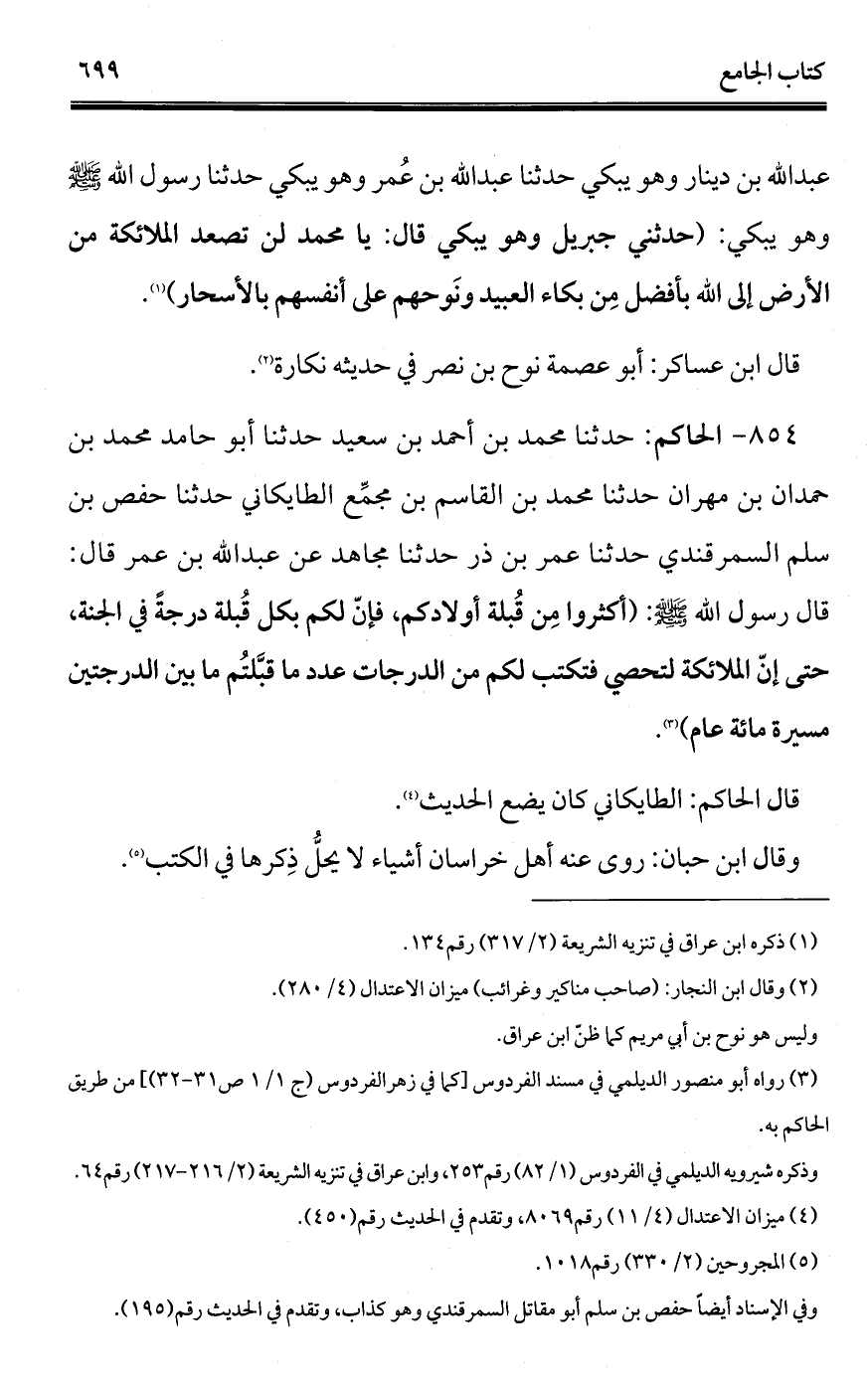 854 - الحاكم: حدثنا محمد بن أحمد بن سعيد حدثنا أبو حامد محمد بن حمدان بن مهران حدثنا محمد بن القاسم بن مجمِّع الطايكاني حدثنا حفص بن سلم السمرقندي حدثنا عمر بن ذر حدثنا مجاهد عن عبد الله بن عمر قال: قال رسول الله - صلى الله عليه وسلم -: (أكثروا مِن قُبلة أولادكم، فإنّ لكم بكل قُبلة درجةً في الجنة، حتى إنّ الملائكة لتحصي فتكتب لكم من الدرجات عدد ما قبَّلتُم ما بين الدرجتين مسيرة مائة عام) (¬1).
