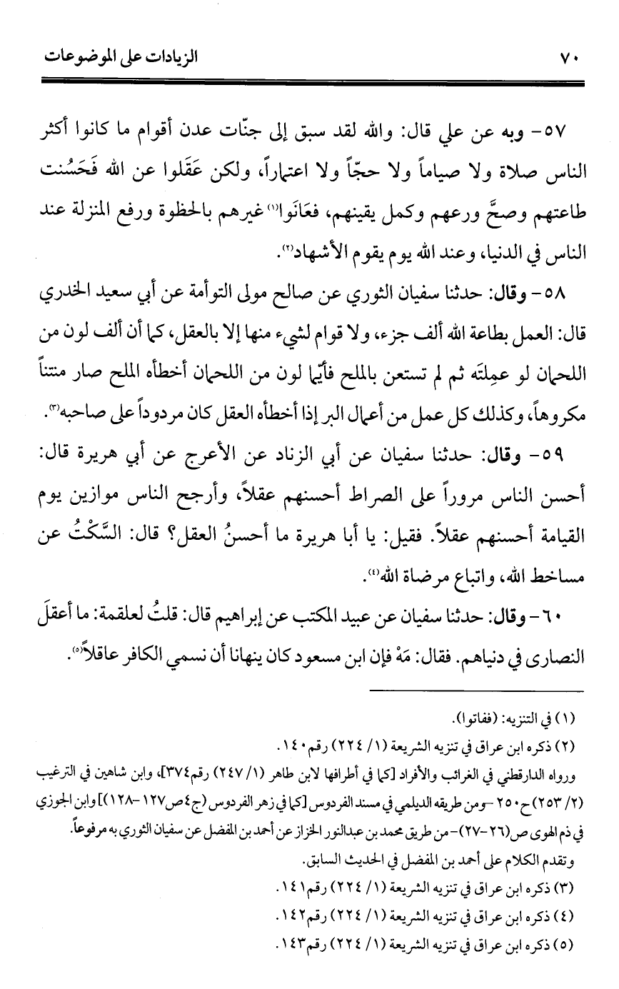 59 - وقال: حدثنا سفيان عن أبي الزناد عن الأعرج عن أبي هريرة قال: أحسن الناس مرورًا على الصراط أحسنهم عقلًا، وأرجح الناس موازين يوم القيامة أحسنهم عقلًا. فقيل: يا أبا هريرة ما أحسنُ العقل؟ قال: السَّكْتُ عن مساخط الله، واتباع مرضاة الله (¬1).