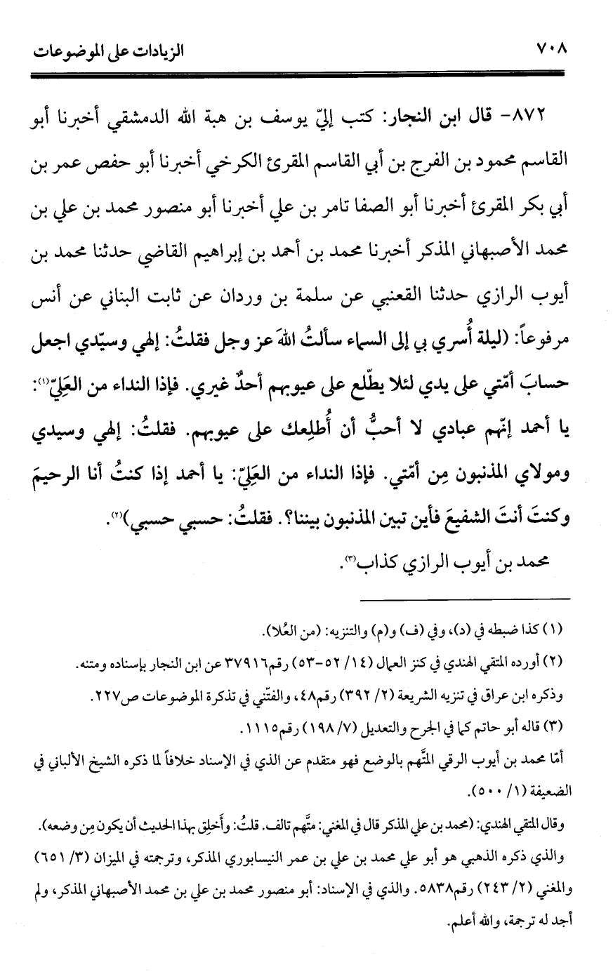 872 - قال ابن النجار: كتب إليّ يوسف بن هبة الله الدمشقي أخبرنا أبو القاسم محمود بن الفرج بن أبي القاسم المقرئ الكرخي أخبرنا أبو حفص عمر بن أبي بكر المقرئ أخبرنا أبو الصفا تامر بن علي أخبرنا أبو منصور محمد بن علي بن محمد الأصبهاني المذكر أخبرنا محمد بن أحمد بن إبراهيم القاضي حدثنا محمد بن أيوب الرازي حدثنا القعنبي عن سلمة بن وردان عن ثابت البناني عن أنس مرفوعًا: (ليلة أُسري بي إلى السماء سألتُ اللهَ عز وجل فقلتُ: إلهي وسيّدي اجعل حسابَ أمّتي على يدي لئلا يطّلع على عيوبهم أحدٌ غيري. فإذا النداء من العَليّ (¬1): يا أحمد إنّهم عبادي لا أحبُّ أن أُطلِعك على عيوبهم. فقلتُ: إلهي وسيدي ومولاي المذنبون مِن أمّتي. فإذا النداء من العَليّ: يا أحمد إذا كنتُ أنا الرحيمَ وكنتَ أنتَ الشفيعَ فأين تبين المذنبون بيننا؟. فقلتُ: حسبي حسبي) (¬2).