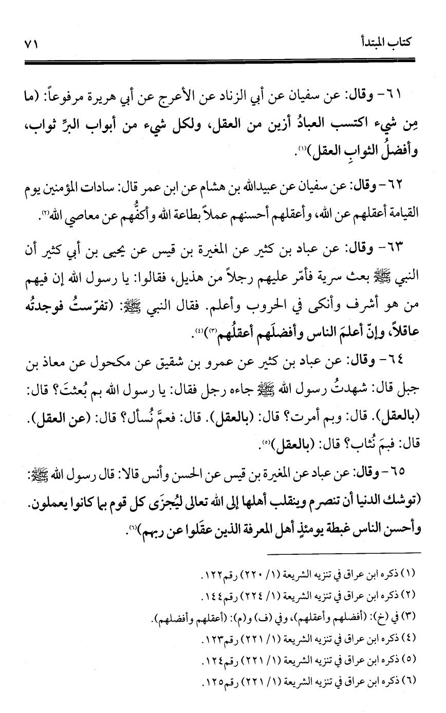 61 - وقال: عن سفيان عن أبي الزناد عن الأعرج عن أبي هريرة مرفوعًا: (ما مِن شيء اكتسب العبادُ أزين من العقل، ولكل شيء من أبواب البرِّ ثواب، وأفضلُ الثوابِ العقل) (¬1).