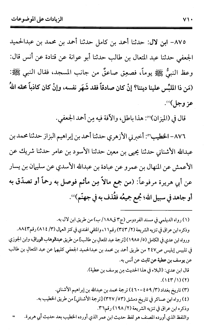876 - الخطيب (¬1): أخبرني الأزهري حدثنا أحمد بن إبراهيم البزاز حدثنا محمد بن عبد الله الأشناني حدثنا يحيى بن معين حدثنا الأسود بن عامر حدثنا شريك عن الأعمش عن المنهال بن عمرو عن عبادة بن عبد الله الأسدي عن سليمان بن يسار عن أبي هريرة مرفوعًا: (من جمع مالًا مِن مأثم فوصل به رحمًا أو تصدّق به أو جاهد في سبيل الله؛ جُمع جميعُه فقُذف به في جهنّم) (¬2).