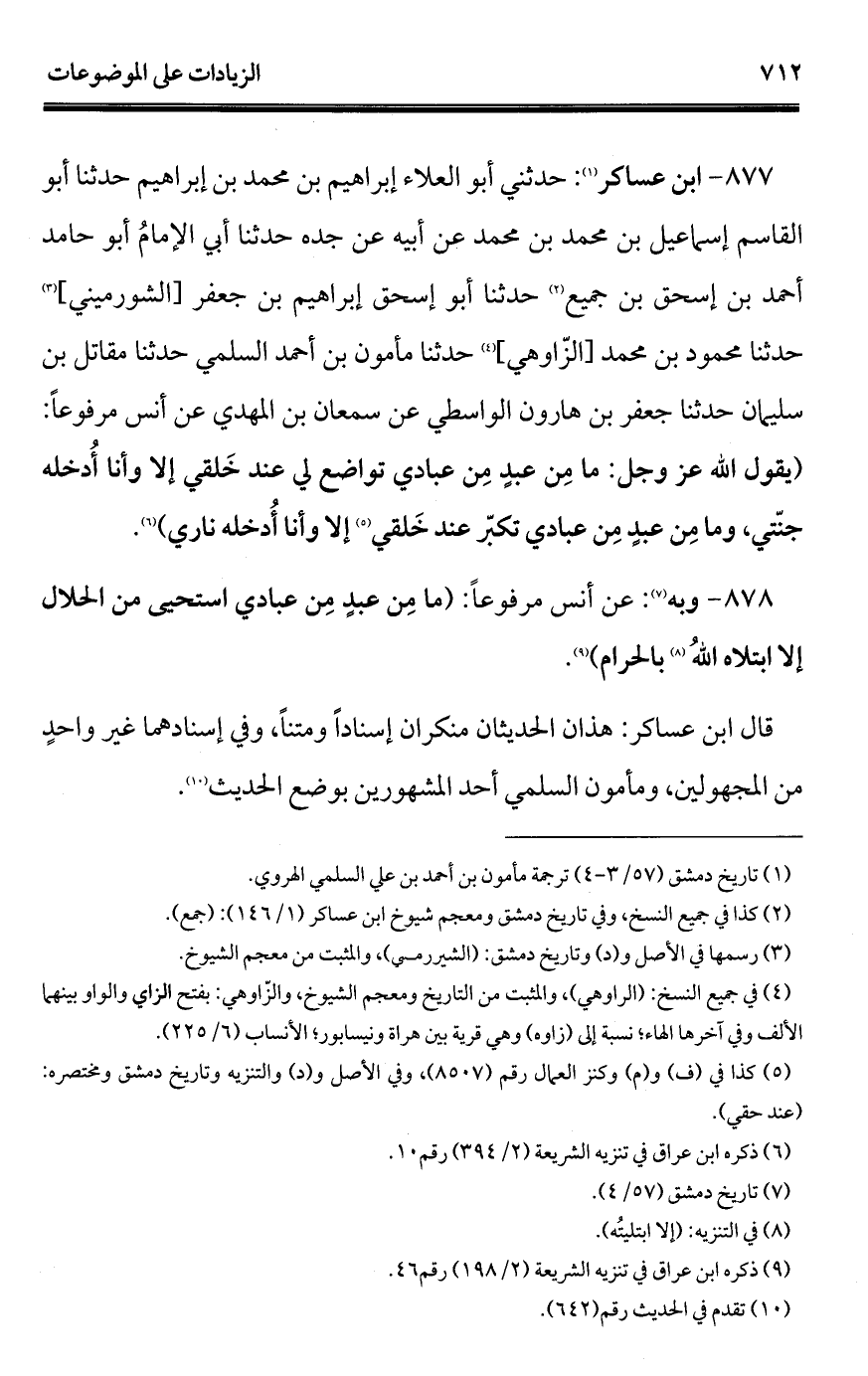 877 - ابن عساكر (¬1): حدثني أبو العلاء إبراهيم بن محمد بن إبراهيم حدثنا أبو القاسم إسماعيل بن محمد بن محمد عن أبيه عن جده حدثنا أبي الإمامُ أبو حامد أحمد بن إسحاق بن جميع (¬2) حدثنا أبو إسحاق إبراهيم بن جعفر [الشورميني] (¬3) حدثنا محمود بن محمد [الزّاوهي] (¬4) حدثنا مأمون بن أحمد السلمي حدثنا مقاتل بن سليمان حدثنا جعفر بن هارون الواسطي عن سمعان بن المهدي عن أنس مرفوعًا: (يقول الله عز وجل: ما مِن عبدٍ مِن عبادي تواضع لي عند خَلقي إلا وأنا أُدخله جنّتي، وما مِن عبدٍ مِن عبادي تكبّر عند خَلقي (¬5) إلا وأنا أُدخله ناري) (¬6).