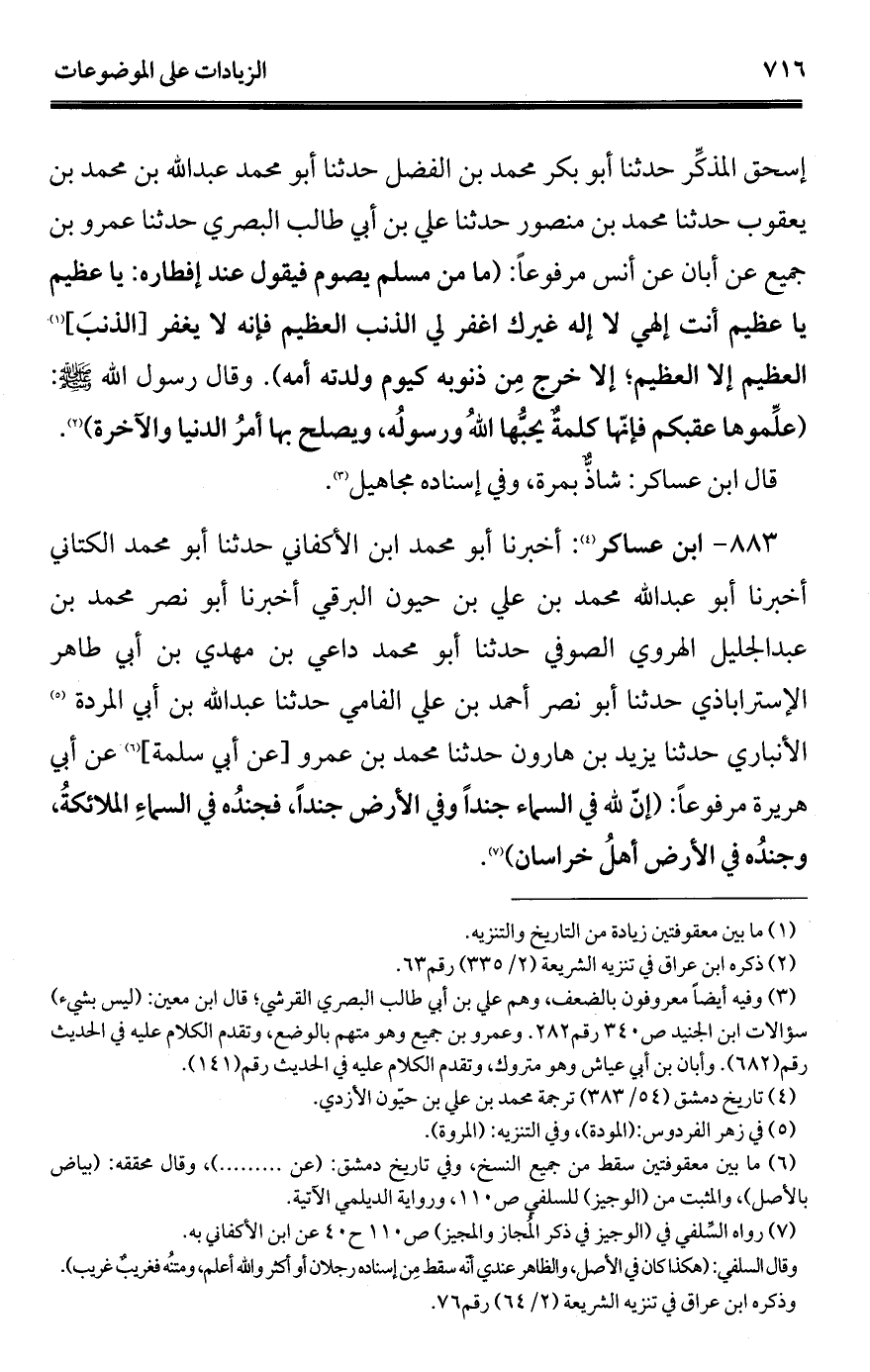 883 - ابن عساكر (¬1): أخبرنا أبو محمد ابن الأكفاني حدثنا أبو محمد الكتاني أخبرنا أبو عبد الله محمد بن علي بن حيون البرقي أخبرنا أبو نصر محمد بن عبد الجليل الهروي الصوفي حدثنا أبو محمد داعي بن مهدي بن أبي طاهر الإستراباذي حدثنا أبو نصر أحمد بن علي الفامي حدثنا عبد الله بن أبي المردة (¬2) الأنباري حدثنا يزيد بن هارون حدثنا محمد بن عمرو [عن أبي سلمة] (¬3) عن أبي هريرة مرفوعًا: (إنّ لله في السماء جندًا وفي الأرض جندًا، فجندُه في السماءِ الملائكةُ، وجندُه في الأرض أهلُ خراسان) (¬4).