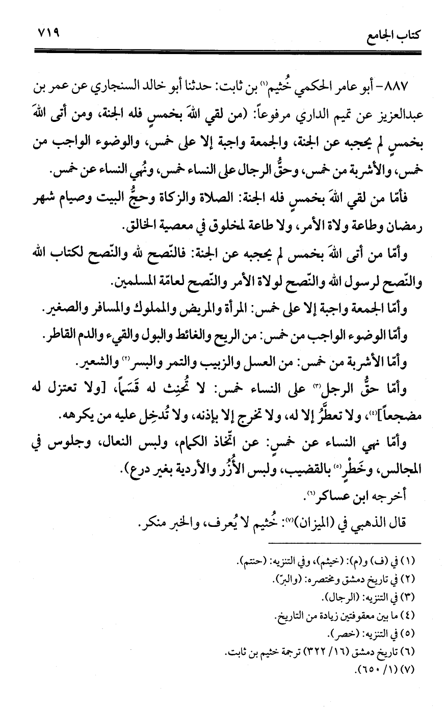 887 - أبو عامر الحكمي خُثيم (¬1) بن ثابت: حدثنا أبو خالد السنجاري عن عمر بن عبد العزيز عن تميم الداري مرفوعًا: (من لقي اللهَ بخمسٍ فله الجنّة، ومن أتى اللهَ بخمسٍ لم يحجبه عن الجنّة، والجمعة واجبة إلا على خمس، والوضوء الواجب من خمس، والأشربة من خمس، وحقُّ الرجال على النساء خمس، ونُهي النساء عن خمس.