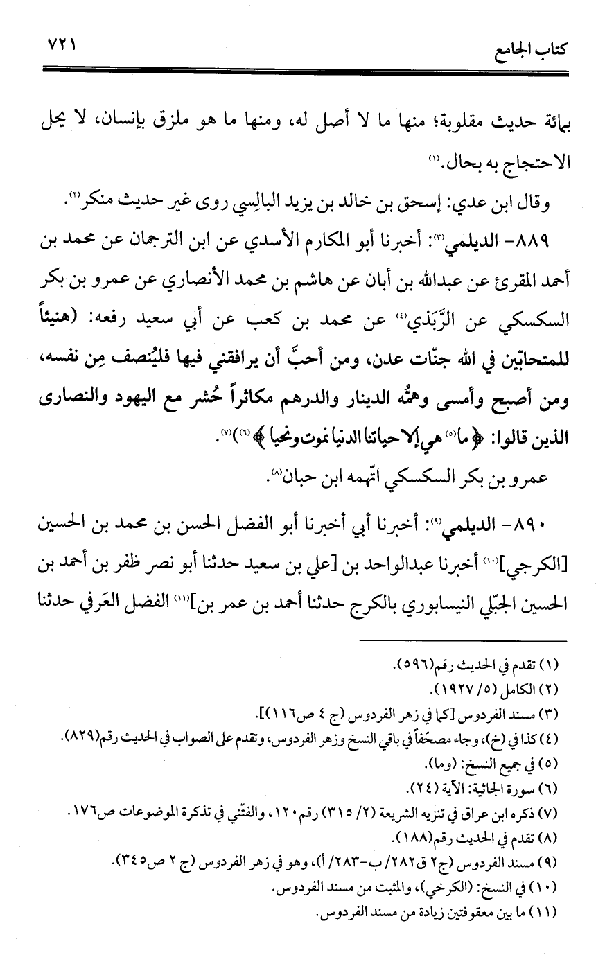 889 - الديلمي (¬1): أخبرنا أبو المكارم الأسدي عن ابن الترجمان عن محمد بن أحمد المقرئ عن عبد الله بن أبان عن هاشم بن محمد الأنصاري عن عمرو بن بكر السكسكي عن الرَّبَذي (¬2) عن محمد بن كعب عن أبي سعيد رفعه: (هنيئًا للمتحابّين في الله جنّات عدن، ومن أحبَّ أن يرافقني فيها فليُنصف مِن نفسه، ومن أصبح وأمسى وهمُّه الدينار والدرهم مكاثرًا حُشر مع اليهود والنصارى الذين قالوا: {مَا (¬3) هِيَ إِلَّا حَيَاتُنَا الدُّنْيَا نَمُوتُ وَنَحْيَا}) (¬4) (¬5).