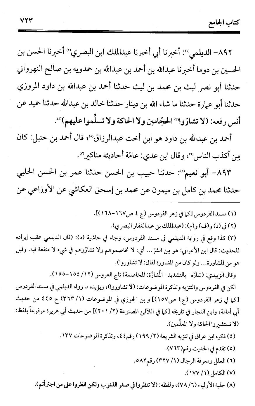 892 - الديلمي (¬1): أخبرنا أبي أخبرنا عبد الملك ابن البصري (¬2) أخبرنا الحسن بن الحسين بن دوما أخبرنا عبد الله بن أحمد بن عبد الله بن حمدويه بن صالح النهرواني حدثنا أبو نصر ليث بن محمد بن ليث حدثنا أحمد بن عبد الله بن داود المروزي حدثنا أبو عمارة حدثنا ما شاء الله بن دينار حدثنا خالد بن عبد الله حدثنا حميد عن أنس رفعه: (لا تشارّوا (¬3) الحجّامين ولا الحاكة ولا تسلِّموا عليهم) (¬4).