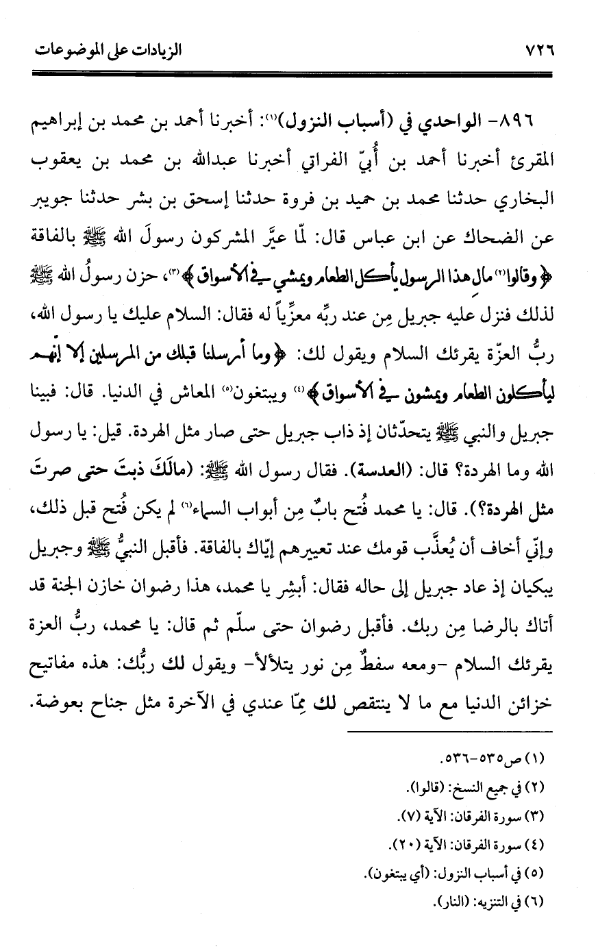896 - الواحدي في (أسباب النزول) (¬1): أخبرنا أحمد بن محمد بن إبراهيم المقرئ أخبرنا أحمد بن أُبيّ الفراتي أخبرنا عبد الله بن محمد بن يعقوب البخاري حدثنا محمد بن حميد بن فروة حدثنا إسحاق بن بشر حدثنا جويبر عن الضحاك عن ابن عباس قال: لمّا عيَّر المشركون رسولَ الله - صلى الله عليه وسلم - بالفاقة {وَقَالُوا (¬2) مَالِ هَذَا الرَّسُولِ يَأْكُلُ الطَّعَامَ وَيَمْشِي فِي الْأَسْوَاقِ} (¬3)، حزن رسولُ الله - صلى الله عليه وسلم - لذلك فنزل عليه جبريل مِن عند ربِّه معزِّيًا له فقال: السلام عليك يا رسول الله، ربُّ العزّة يقرئك السلام ويقول لك: {وَمَا أَرْسَلْنَا قَبْلَكَ مِنَ الْمُرْسَلِينَ إِلَّا إِنَّهُمْ لَيَأْكُلُونَ الطَّعَامَ وَيَمْشُونَ فِي الْأَسْوَاقِ} (¬4) ويبتغون (¬5) المعاش في الدنيا. قال: فبينا جبريل والنبي - صلى الله عليه وسلم - يتحدّثان إذ ذاب جبريل حتَّى صار مثل الهردة. قيل: يا رسول الله وما الهردة؟ قال: (العدسة). فقال رسول الله - صلى الله عليه وسلم -: (مالَكَ ذبتَ حتَّى صرتَ مثل الهردة؟). قال: يا محمد فُتح بابٌ مِن أبواب السماء (¬6) لم يكن فُتح قبل ذلك، وإنّي أخاف أن يُعذَّب قومك عند تعييرهم إيّاك بالفاقة. فأقبل النبيُّ - صلى الله عليه وسلم - وجبريل يبكيان إذ عاد جبريل إلى حاله فقال: أبشِر يا محمد، هذا رضوان خازن الجنّة قد أتاك بالرضا مِن ربك. فأقبل رضوان حتَّى سلّم ثم قال: يا محمد، ربُّ العزة يقرئك السلام - ومعه سفطٌ مِن نور يتلألأ - ويقول لك ربُّك: هذه مفاتيح خزائن الدنيا مع ما لا ينتقص لك مِمّا عندي في الآخرة مثل جناح بعوضة.