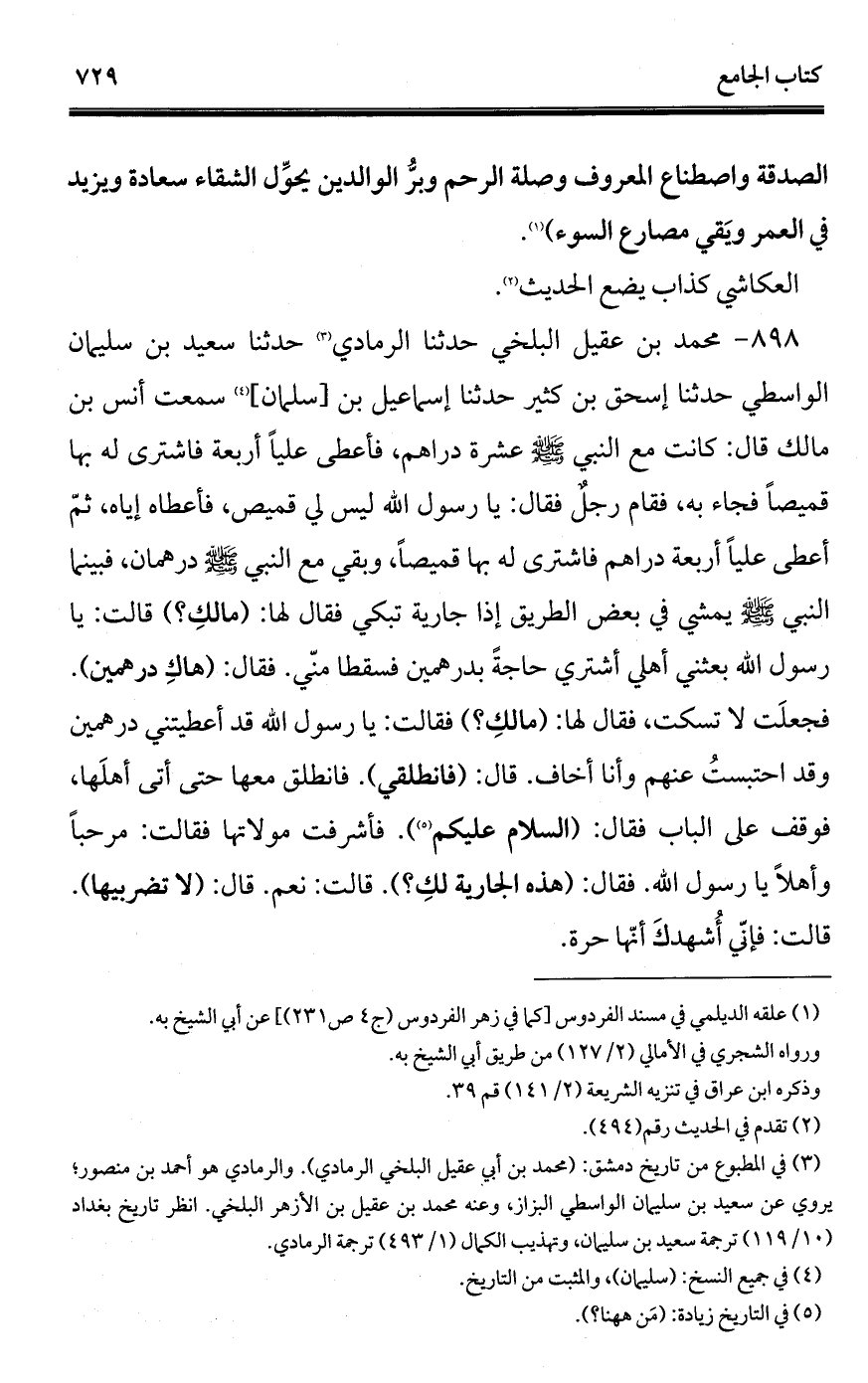 898 - محمد بن عقيل البلخي حدثنا الرمادي (¬1) حدثنا سعيد بن سليمان الواسطي حدثنا إسحاق بن كثير حدثنا إسماعيل بن [سلمان] (¬2) سمعت أنس بن مالك قال: كانت مع النبي - صلى الله عليه وسلم - عشرة دراهم، فأعطى عليًا أربعة فاشترى له بها قميصًا فجاء به، فقام رجل فقال: يا رسول الله ليس لي قميص، فأعطاه إياه، ثمّ أعطى عليًّا أربعة دراهم فاشترى له بها قميصًا، وبقي مع النبي - صلى الله عليه وسلم - درهمان، فبينما النبي - صلى الله عليه وسلم - يمشي في بعض الطريق إذا جارية تبكي فقال لها: (مالكِ؟) قالت: يا رسول الله بعثني أهلي أشتري حاجة بدرهمين فسقطا منّي. فقال: (هاكِ درهمين). فجعلَت لا تسكت، فقال لها: (مالكِ؟) فقالت: يا رسول الله قد أعطيتني درهمين وقد احتبستُ عنهم وأنا أخاف. قال: (فانطلقي). فانطلق معها حتَّى أتى أهلَها، فوقف على الباب فقال: (السلام عليكم) (¬3). فأشرفت مولاتها فقالت: مرحبًا وأهلًا يا رسول الله. فقال: (هذه الجارية لكِ؟). قالت: نعم. قال: (لا تضربيها). قالت: فإنّي أُشهدكَ أنّها حرة.